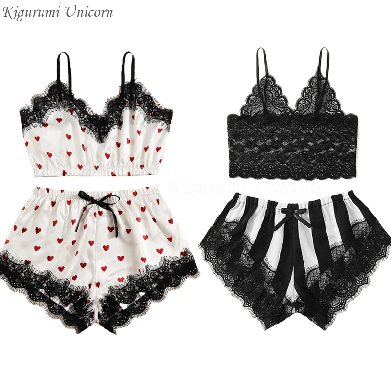Сексуальная Женская атласная шелковая кружевная пижама в полоску с цветочным кружевом и V-образным вырезом без рукавов Нижнее белье, топы + шорты для сна женские пижамные комплекты