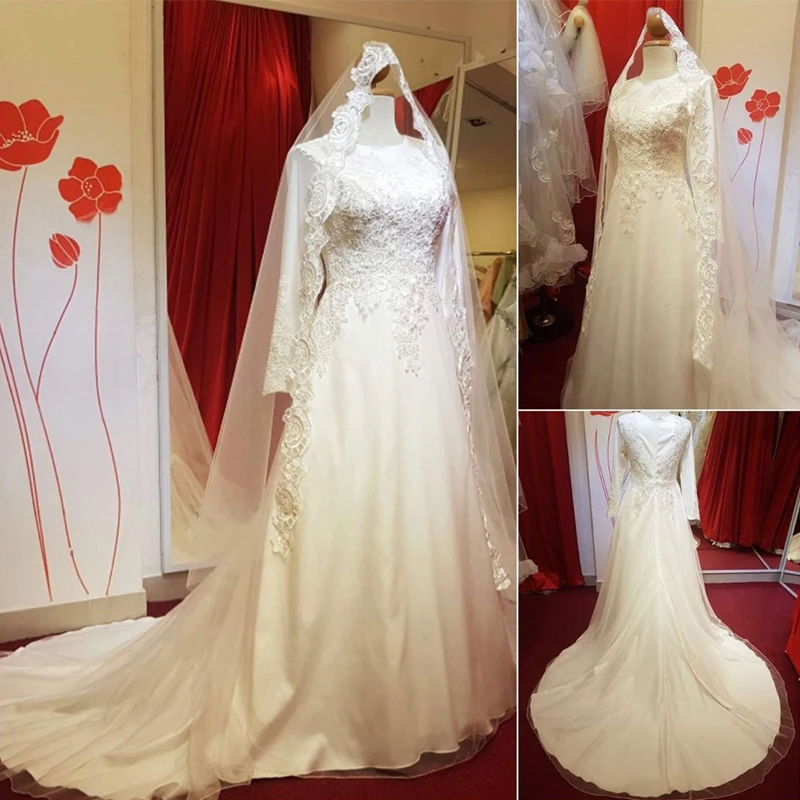 Свадебное платье Hijab, бальное платье с длинными рукавами и кружевной вышивкой, свадебное платье может быть настроено по цвету