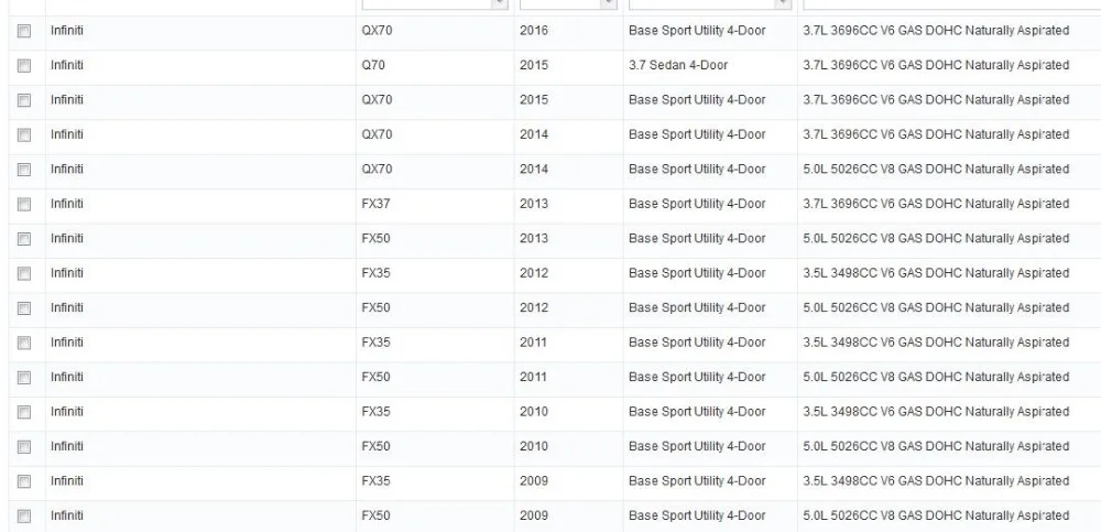 Infiniti 2009-2012 FX35 Базовая Спортивная УтилитаInfiniti 2013 FX37 Базовая Спортивная УтилитаInfiniti 2009-2013 FX50 Базовая Спортивная УтилитаInfiniti 2015 Q70 3,7 седанInfiniti 2014-2016 QX70 Базовая Спортивная Утилита