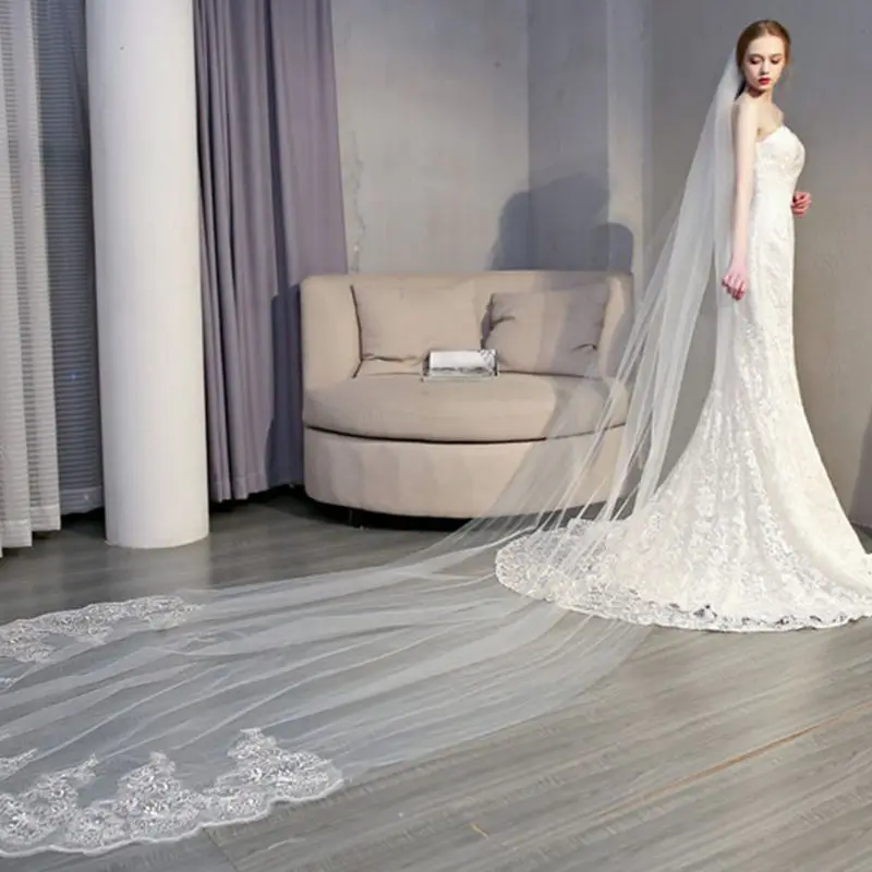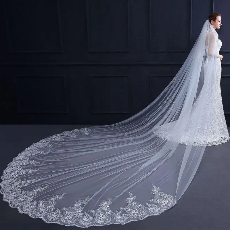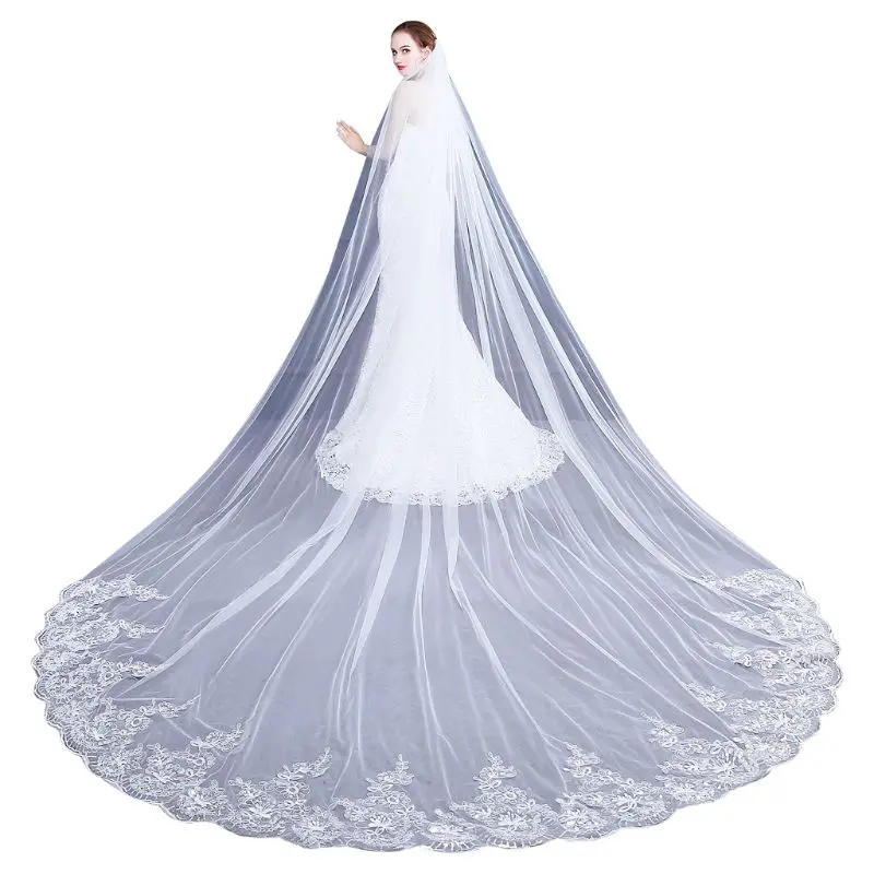 4 м Однослойная Женская Длинная свадебная вуаль со шлейфом, вышитая Цветочная Кружевная аппликация с зубчатой отделкой, свадебная вуаль с расческой