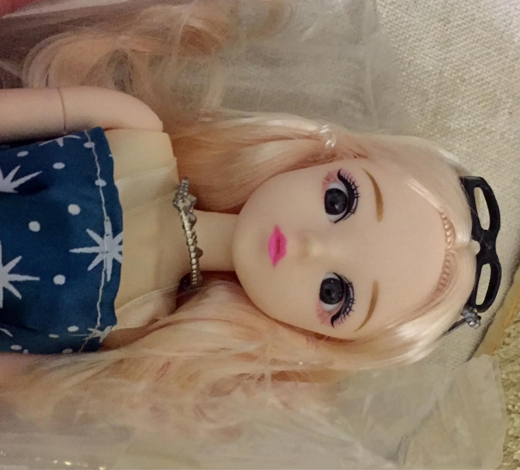 кукла очень красивая. хорошо прорисованые глаза. волосы хоть и прошиты редко ,но густые. дочка в восторге. все целое, все шарниры работают. доставка две недели.