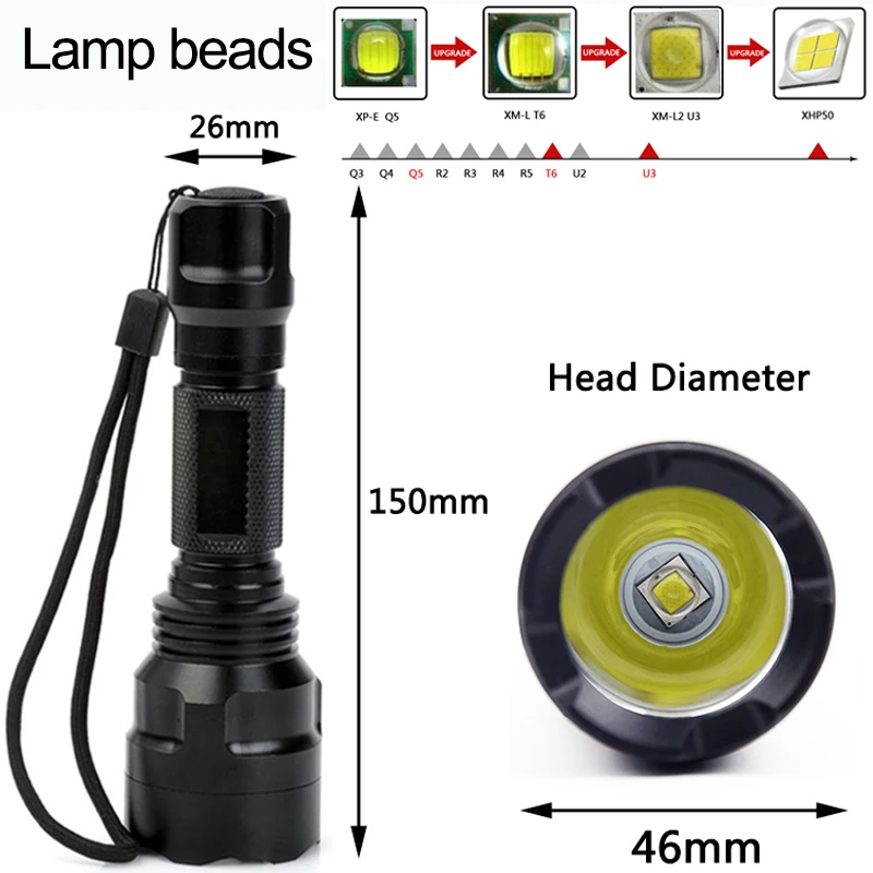· Светильник:XP-E Q5 белый/XP-E Q5 красный/XP-E Q5 зеленый/T6.L2.XHP50 белый· Emitterype:CREE XP-E Q5/T6/L2/XHP50· Цвет:Черный• Время работы:2-4 часаS· Входное напряжение:3,6-4,2· Яркость:3800 люмен· Материал:Алюминий из алюминиевого сплава· Расположение переключателя:Нажимной хвостовой колпачок· Тип переключателя:Clicky/Clickie· Светодиодный срок службы:100000 часов· Максимальное расстояние освещения:200 м· 5 режимов: Высокий/средний/низкий/Стробоскоп/sos· Конфигурация батареи:1 перезаряжаемая литиевая батарея 18650· Водонепроницаемый:IP66 ( undeВода 1 м, используется в дождливый день, не может нырять)