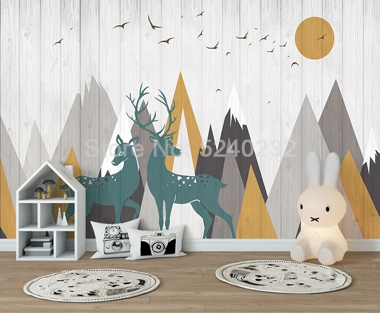 Пользовательские 3D обои фрески деревянная доска ручная роспись мультфильм горы птица Восход Лес Лось роспись Детская Спальня украшение