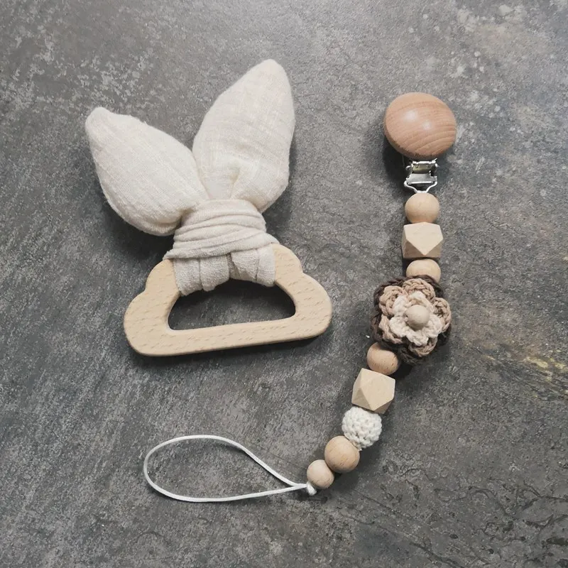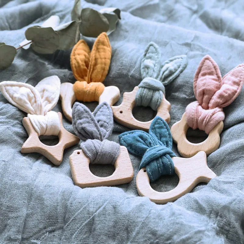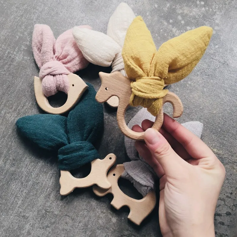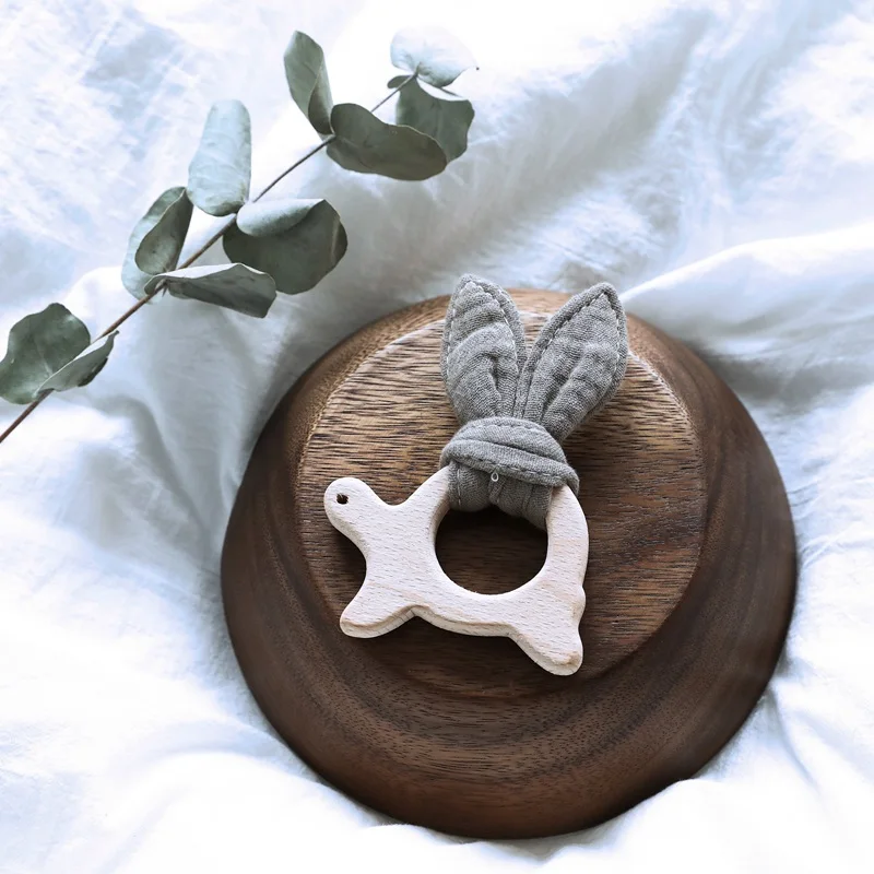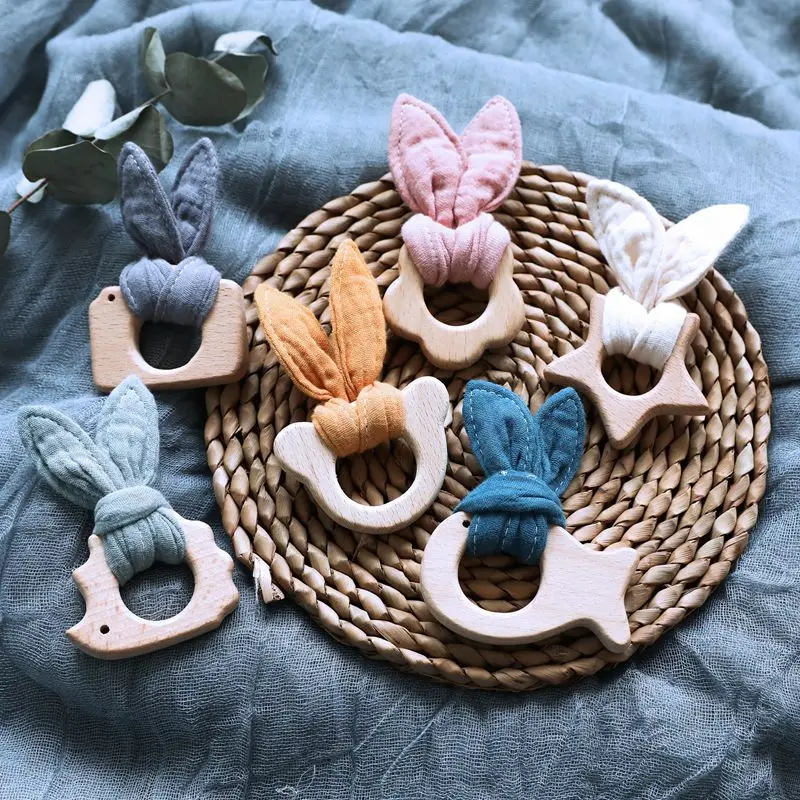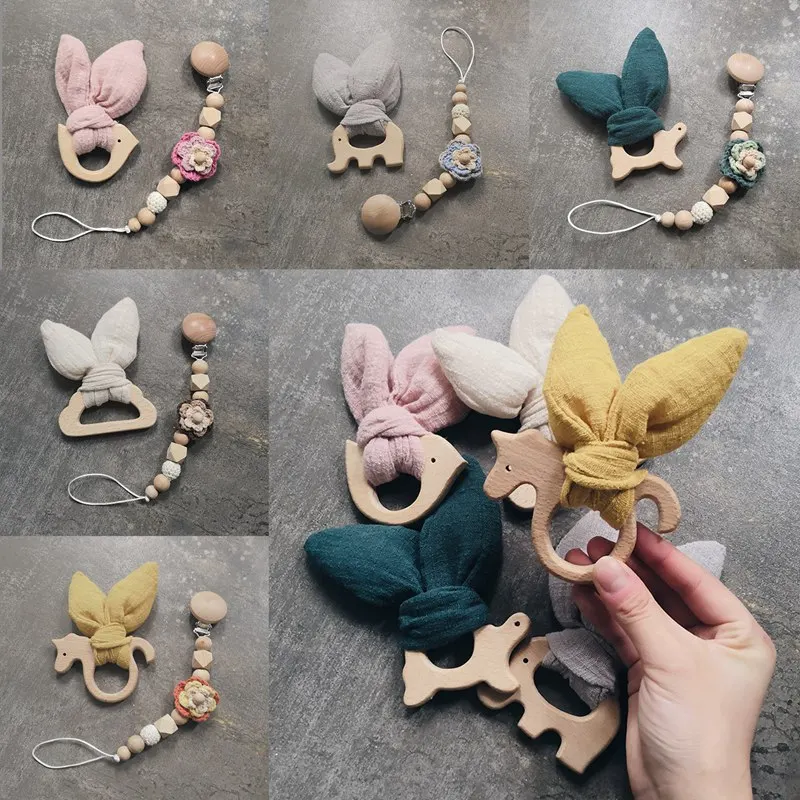 Оптовая продажа, Детские Прорезыватели с заячьими ушками и цепочками-пустышками, деревянные игрушки для прорезывания зубов с животными, игрушки из бука и дерева для игры в грызуны, игрушки для тренажерного зала, детская погремушка
