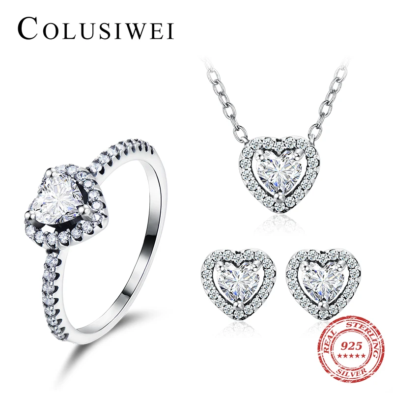 Colusiwei Аутентичные 925 стерлингового серебра ювелирные изделия набор сверкающие с сердцем на палец, кольца и серьги и кулон ожерелье ювелирные наборы