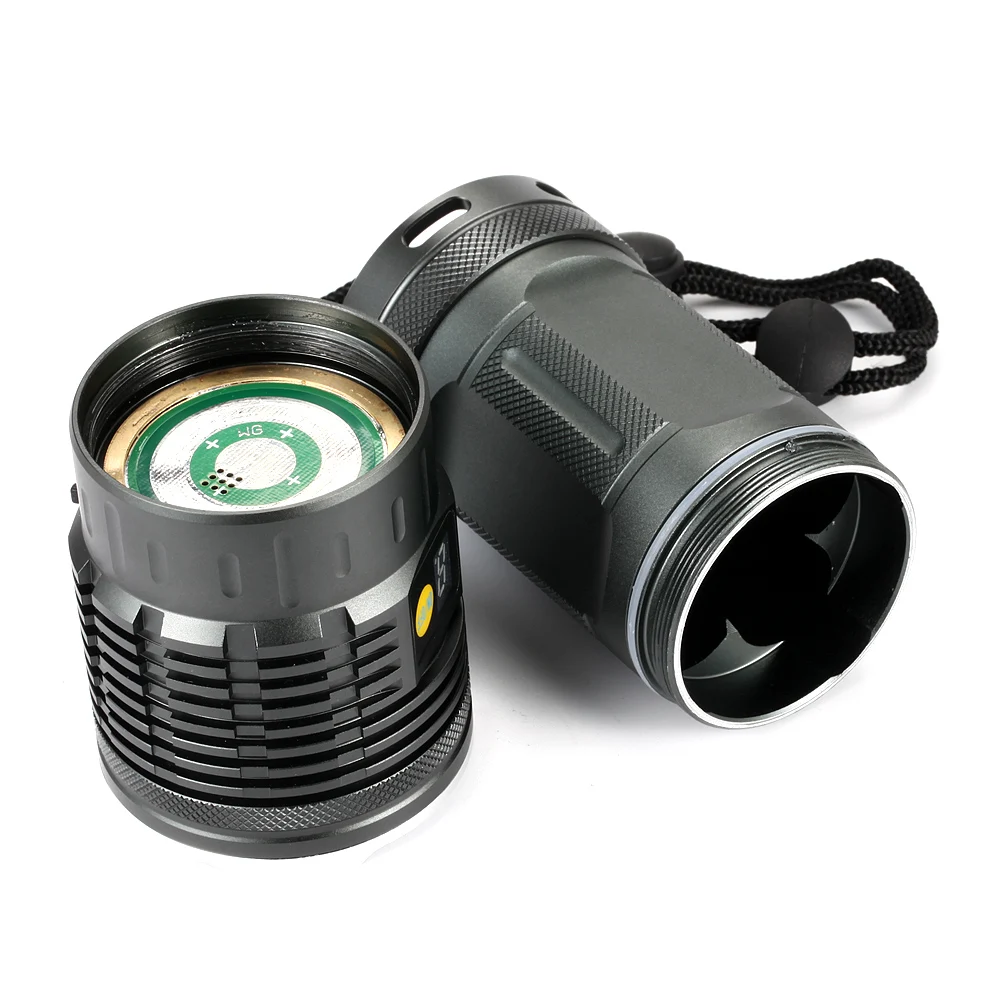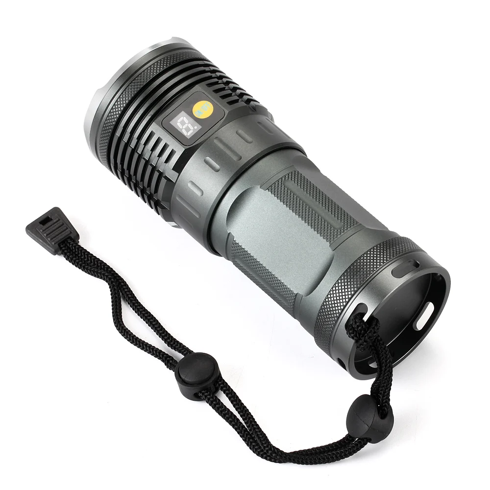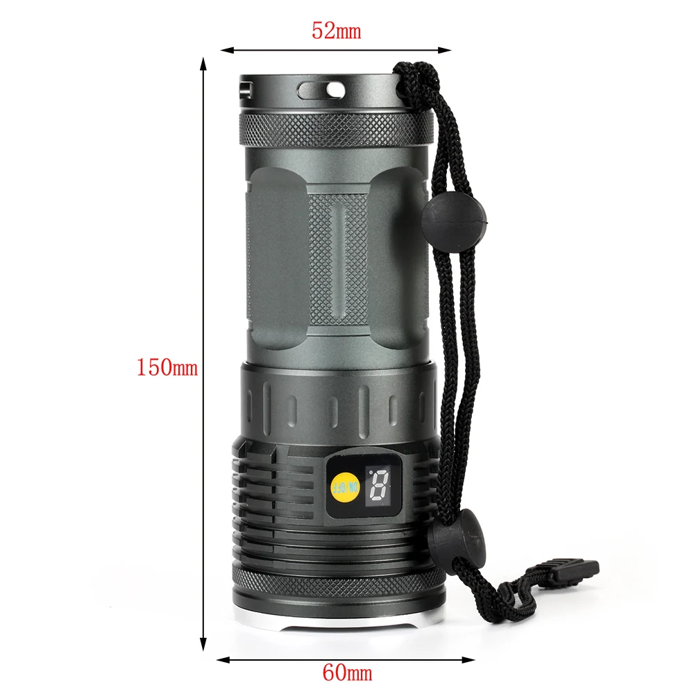 Это супер яркий фонарик, изготовленный из 6061T алюминиевого сплава, этот фонарик достаточно прочный и долговечный для длительного использования. Супер яркий, ослепляющий эффект. Он водонепроницаемый, но не помещайте его в воду. Со сроком службы до 100000 часов или более, не нужно рассматривать замену колпачка на всю жизнь. Подходит для езды на велосипеде, кемпинга, альпинизма, охоты, рыбалки, чрезвычайных ситуаций и ремонта дома. Носите с помощью горлышка, удобно носить с собой. Особенности: Тип: XML-T6 светодиодный Светодиодный Количество: 12 Световой поток: Максимальная выходная мощность 20000 люменов Расположение переключателя: Средний Водонепроницаемость: Да 3 режима: высокий/средний/стробоскоп (Длительное нажатие кнопки) Материал: корпус из алюминиевого сплава 6061, стеклянный объектив с покрытием Источники питания: 4x18650 3,7 V Перезаряжаемые батарея (не входит в комплект) (Чип на плате) Срок службы: 100000 часов Цветность света: белый Пресс и удерживайте кнопку в течение 1,5 секунды, чтобы включить/выключить светильник. Нажмите 1 раз: высокая яркость (100%), цифровой дисплей показывает: H Нажмите 2 раза: средняя яркость (50%), цифровой дисплей показывает: E Нажмите 3 раза: низкая яркость (15%), цифровой дисплей показывает: L Цифровой дисплей индикатор заряда батареи: Цифровой дисплей показывает «9»: 90%-100% & «8» для 80%-90% Цифровой дисплей показывает «7»: 70%-80% & «6» для 60%-70% Цифровой дисплей показывает «5»: 50%-60% & «4» для 40%-50% Цифровой дисплей показывает «3»: 30%-40% и «2» для 20%-30% Цифровой дисплей показывает «1»: 10%-20% и «0» для 0-10% Рабочее напряжение: DC 3,7 V ~ 4,2 V Источник питания: 4x3,7 V 18650 перезаряжаемый литий-ионный аккумулятор батареи (не входит в комплект) Комплект поставки: 1x светодиодный 12T6 фонарик (не аккумулятор) 1xAC зарядное устройство