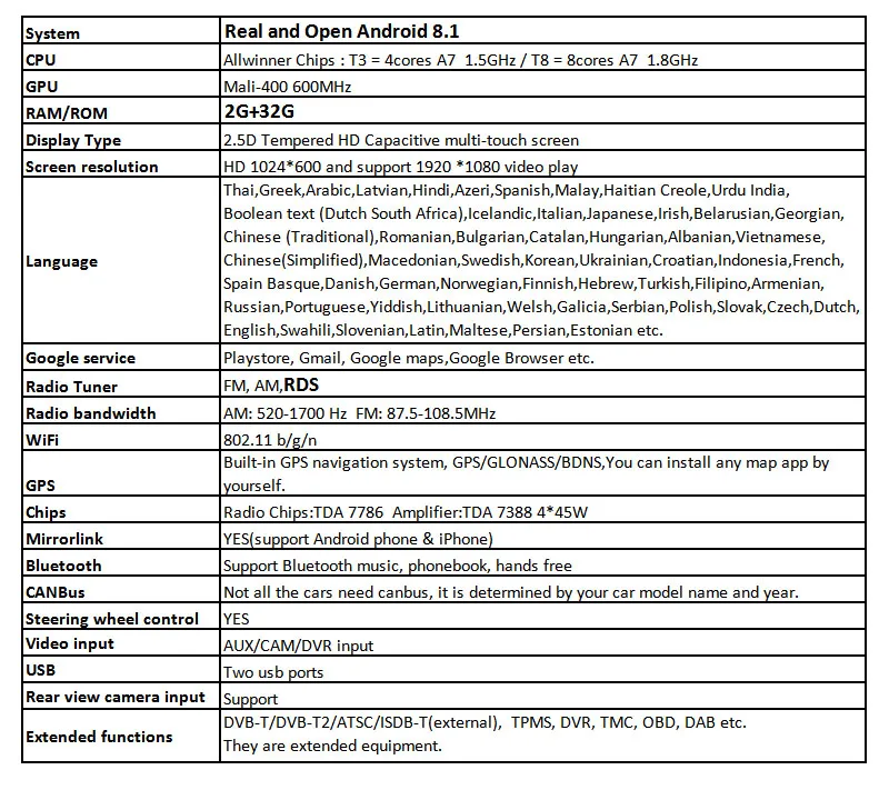 Чистый Android 8,1Автомобильный DVD-плеер +ПоддержкаУправление рулевым колесом+T3 = 4 ядра A7 1,5 ГГц/T8 = 8 ядер A7 1,8 ГГц ЦП+ 2GB RAM + 32GB Memory +HD и IPS и 2,5 DScreen+Емкостный экран+ Wifi+ GPS навигация +ДляЗеркальная ссылка на iPhone/Android мобильный телефон +Bluetooth (Встроенный)+ FM/AM +RDS +Функция USB DVR (опционально)+OBD II (опционально)+1080P Vedio Play +Камера заднего вида (Опционально)+ТВ (Опционально)