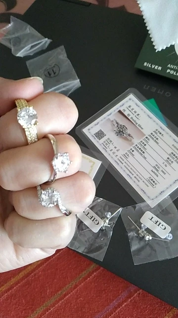 Pierścionek bardzo ładny , z próbami, błyszczący kamień. Tylko kamień jest mniejszy , nie 2 ct , kolczyki które kupiłam i tez były 2 ct, są sporo większe. Miły prezent w postaci kolczyków