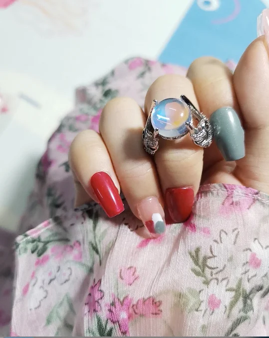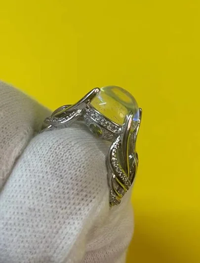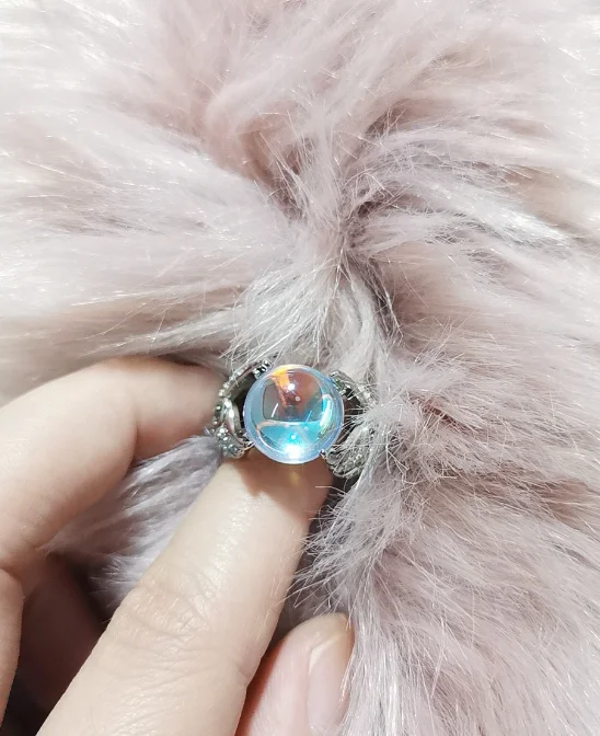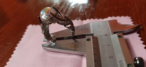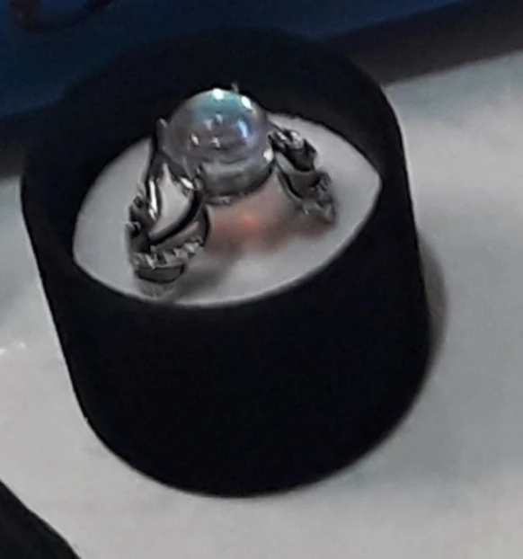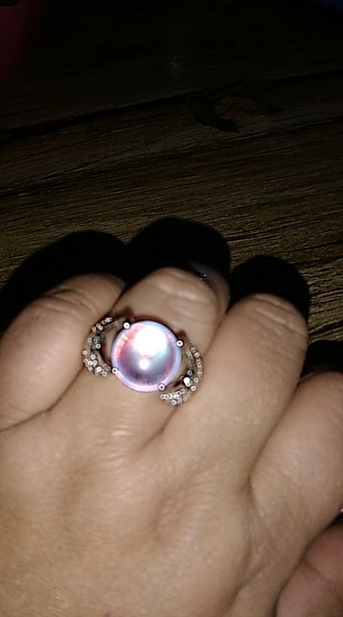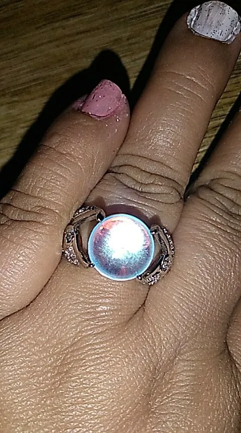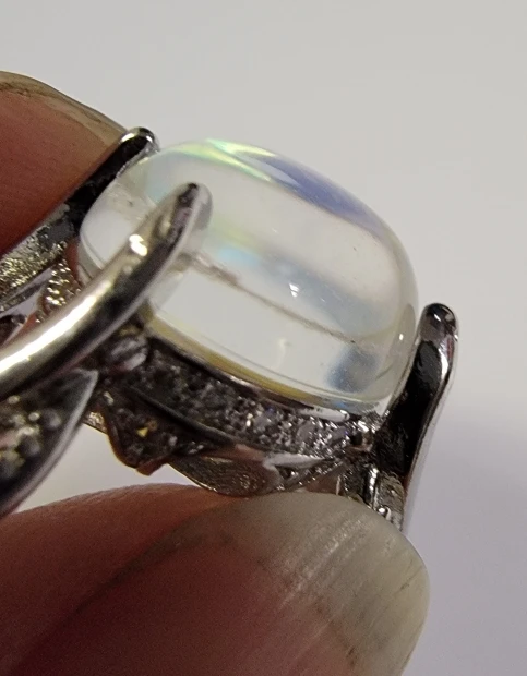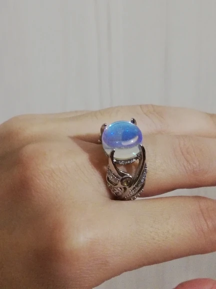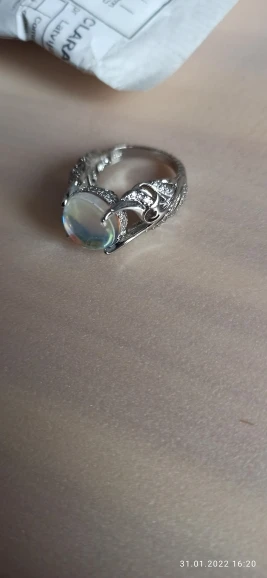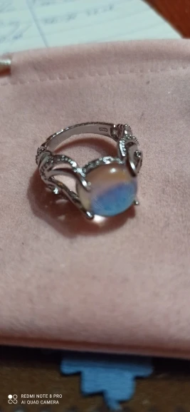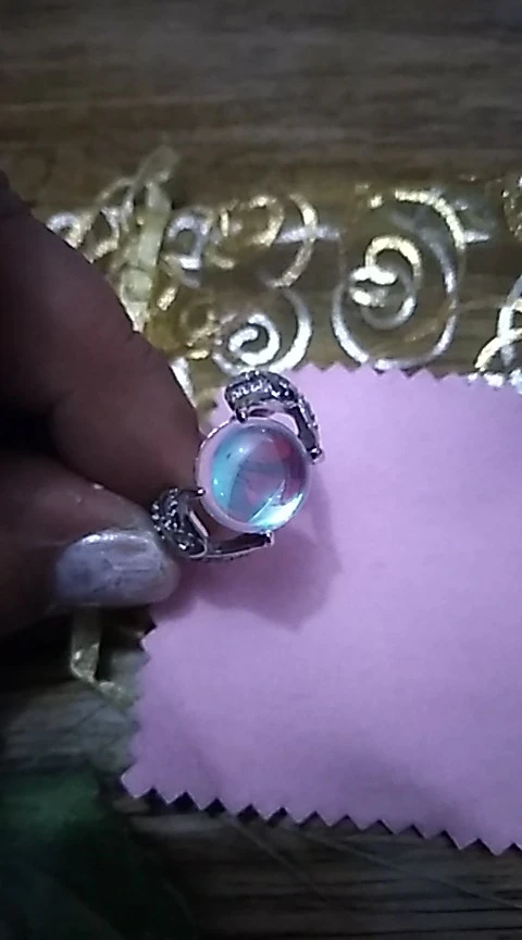 Изумительное колечко! Оправа дополнена маленькими бесцветными камешками. Большой лунный "камень" склеен из двух полусфер. но это не портит впечатление. Он светится преломляя лучи разными цветами. Очень красивый перстень! Спасибо продавцу!