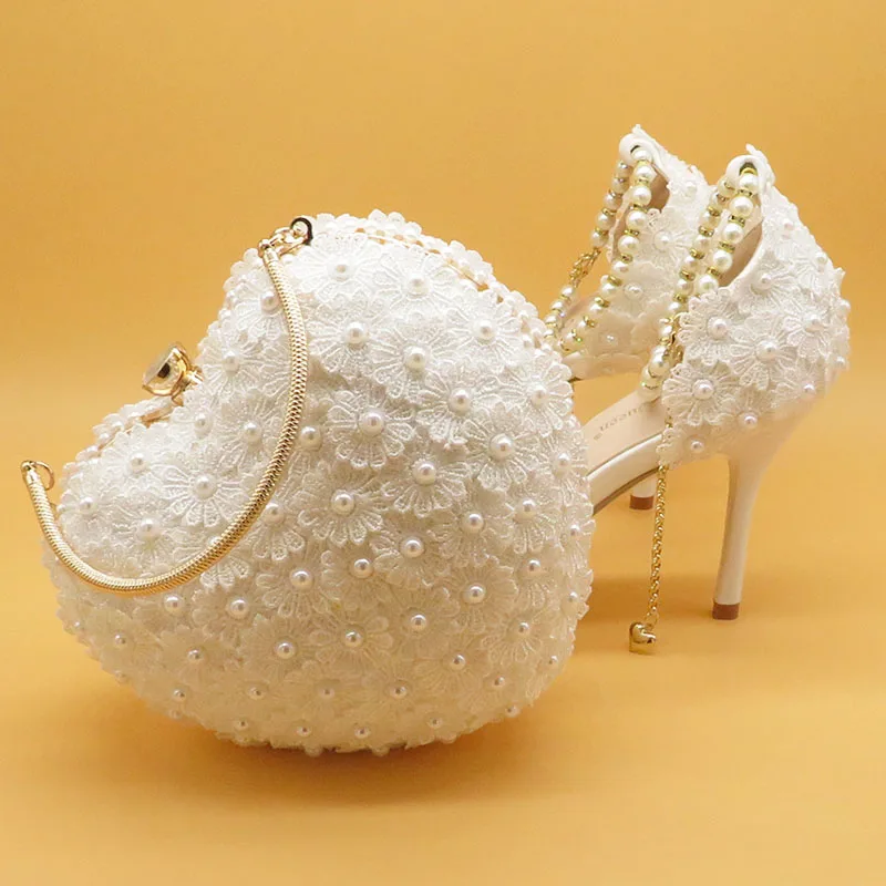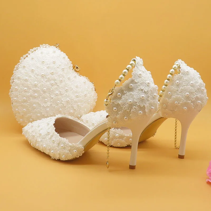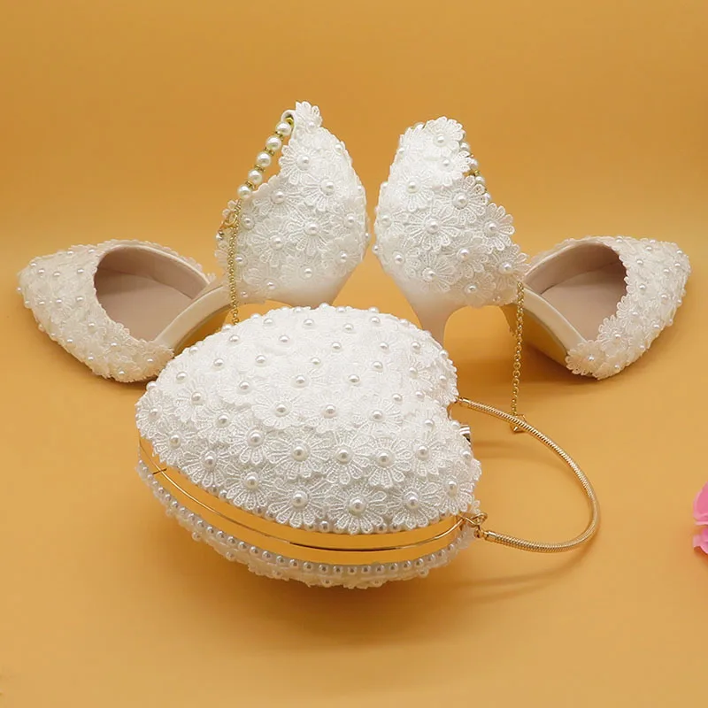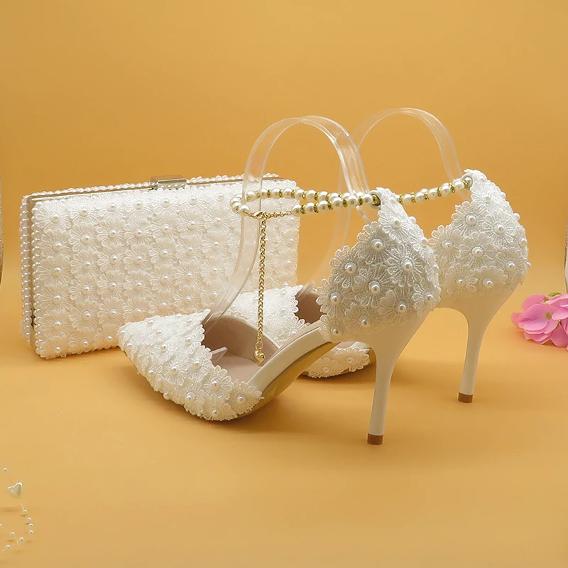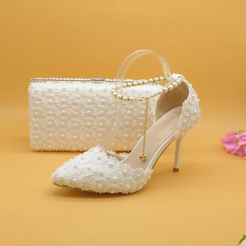 Комплект из белых туфель и сумки с цветочным кружевом, туфли на высоком каблуке с острым носком и ремешком на щиколотке, женские вечерние туфли с сумочкой на шнуровке