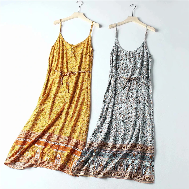 Винтажное шикарное женское пляжное платье без рукавов с цветочным принтом, богемное платье средней длины на бретелях из искусственного хлопка в стиле бохо, платья