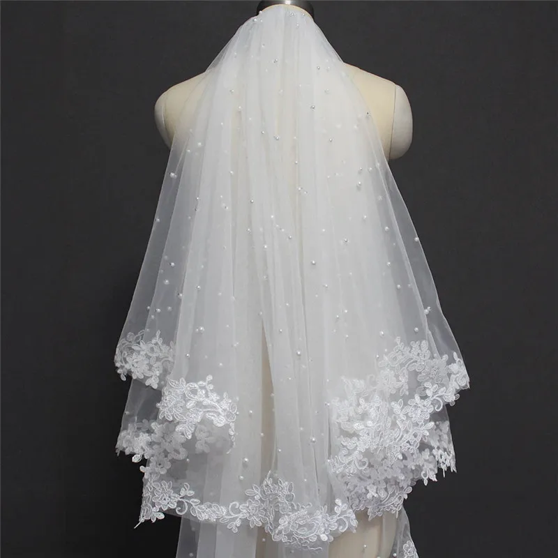 Жемчужная свадебная вуаль с кружевом, 2 слоя, покрытие лица, жемчуг...