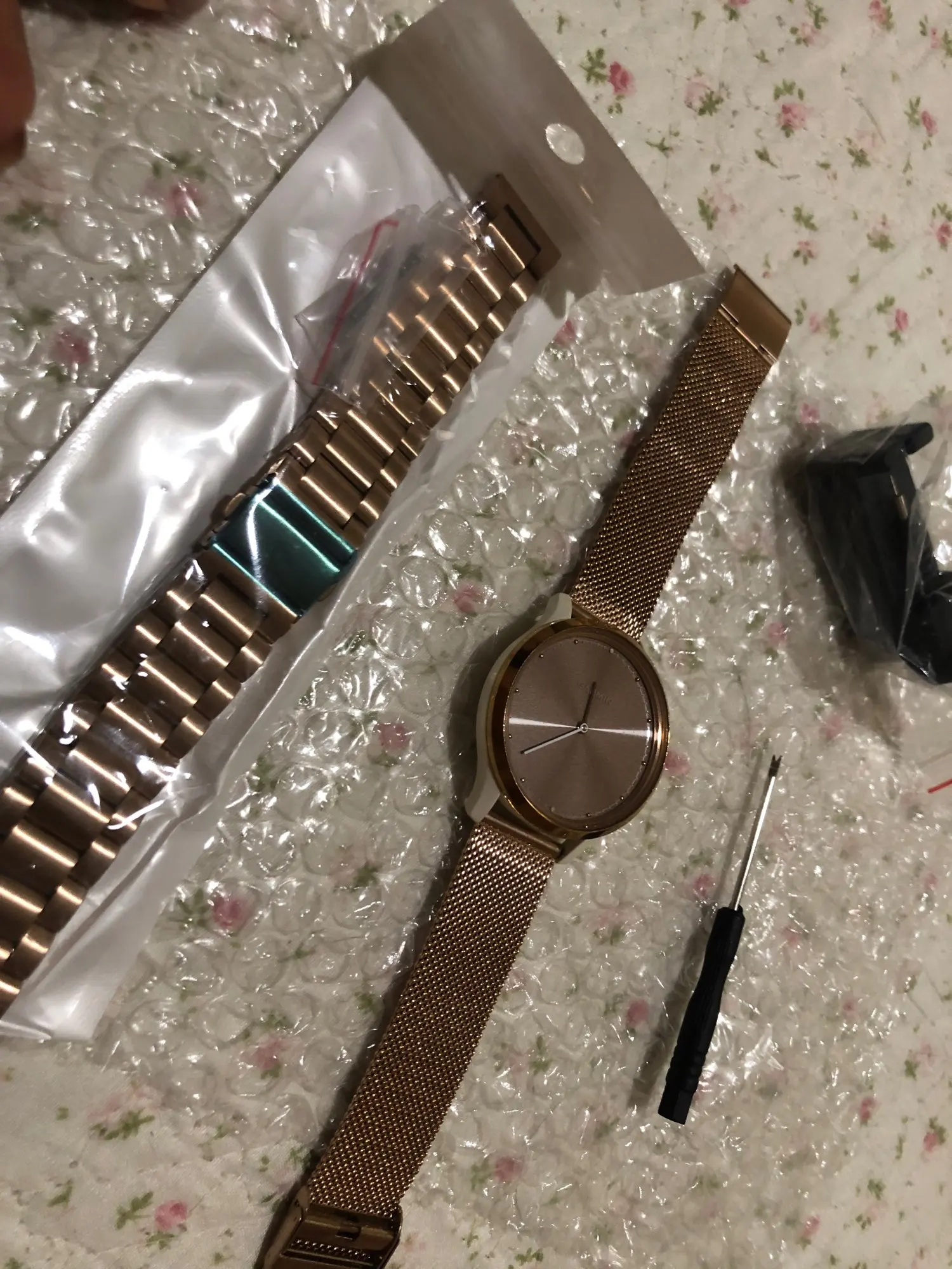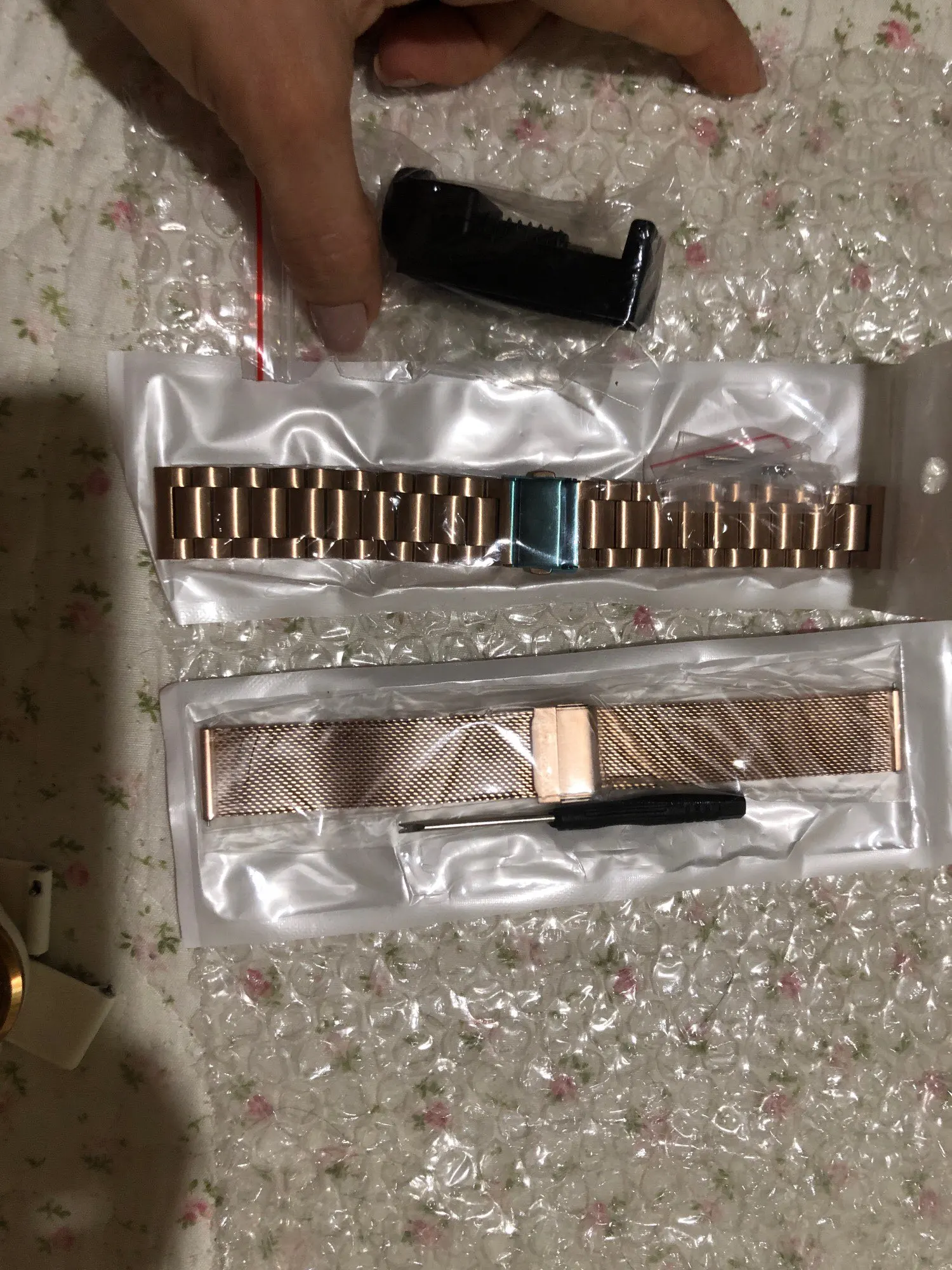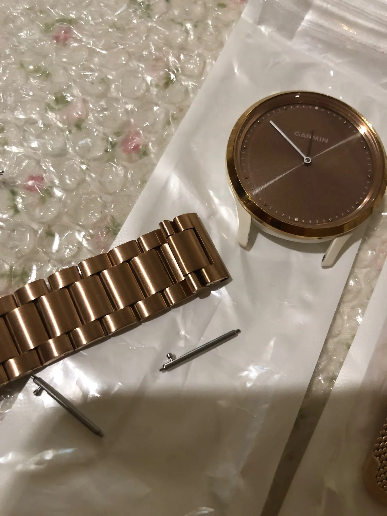 Хороший продукт Если вы выглядите очень близко, цвет немного отличается от оригинального garmin rose gold, но не так плохо. Хорошее качество. В комплект также входит устройство, которое помогает изменить длину для обоих наручных часов.