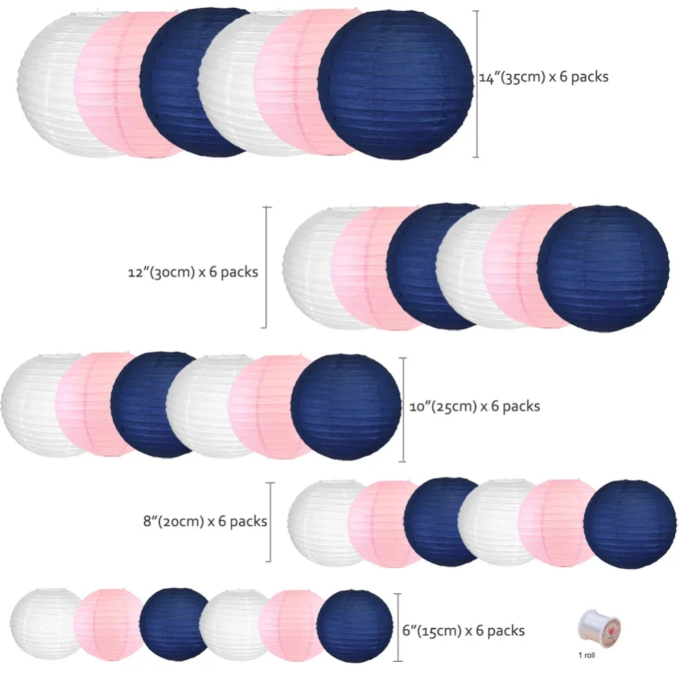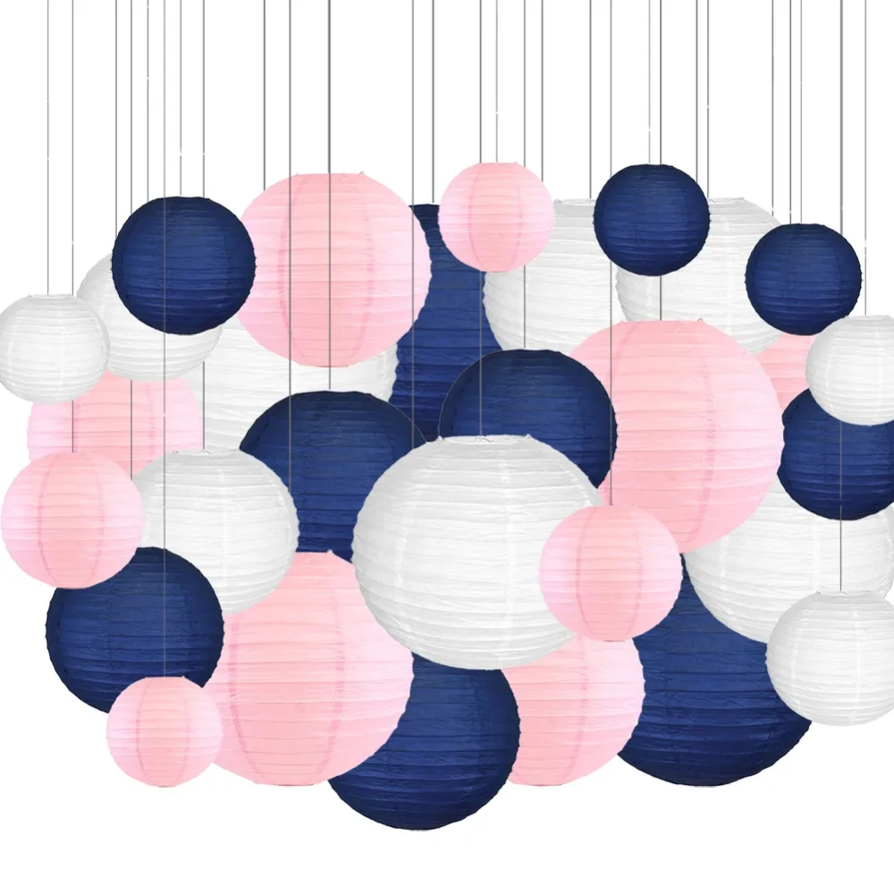 Белый розовый темно-синийНабор бумажных фонарей поставляется в комплекте с 30 разными розовыми темно-синими и белая Круглая Бумажная фонариками. Выбор разных размеров позволяет сделать элегантный фон или повесить его по комнате. Подходит для украшения дома или улицы