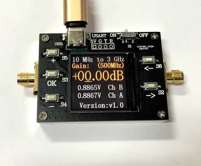 Особенности: Источник питания: интерфейс TYPECЧастотный диапазон: 10 МГц-3 ГГцP1DB: 20DBMУровень шума: 5DB@0.5GHZРегулируемый динамический диапазон усиления: + 44 to-76DBМинимальный шаг: 0,01 дБВходное и Выходное сопротивление: 50 ΩВходное и выходное отношение стоящей волны: 1.5@0.5GHZ (см. Кривую S11 для получения подробной информации)Максимальное усиление усиления: + 44DB@0.5GHZ (см. Кривую S21 для других частотных точек)Режим управления программой: ключ с 1,3-дюймовым TFT; Интерфейс USB; Режим последовательного порта TTL (для конкретного протокола обратитесь к пятому обзору протокола ассоциации) 3,1 + 40 дБ @ 500 МГц коэффициент усиления 3,2 + 30 дБ @ 500 МГц коэффициент усиления 3,3 + 20 дБ @ 500 МГц коэффициент усиления 3,4 + 10 дБ @ 500 МГц коэффициент усиления 3,5 0 дБ @ 500 МГц коэффициент усиления 3,6-10 дБ @ 500 МГц кривая затухания 3,7-20 дБ @ 500 МГц кривая затухания 3,8-30 дБ @ 500 МГц кривая затухания 3,8-40 дБ @ 500 МГц кривая затухания 3,9-50 дБ @ 500 МГц кривая затухания 3,10-60 дБ @ 500 МГц кривая затухания