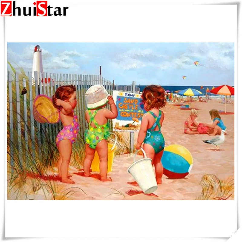 Алмазная живопись 5d, квадратнаякруглая Алмазная вышивка, пляж, маленькая девочка, стразы, сделай сам, мозаика, украшение для дома, Прямая поставка
