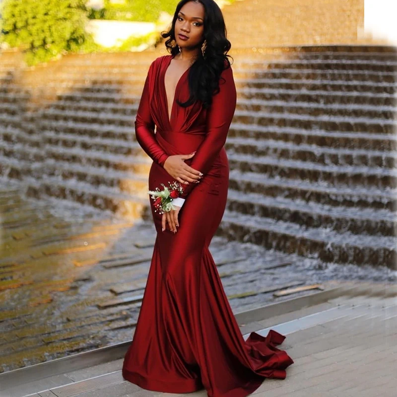 Темно-красные платья YiMinpwp для подружек невесты, платья с глубоким V-образным вырезом и длинным рукавом, свадебные платья со шлейфом и драпировкой