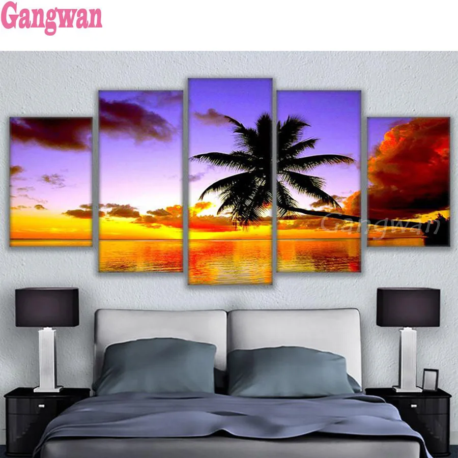 Diy камни в форме ромба круглый дрель алмазов картина 5 шт. Пальмы Закат Морской пейзаж 5d Алмазная мозаика вышивка с украшением в виде кристаллов