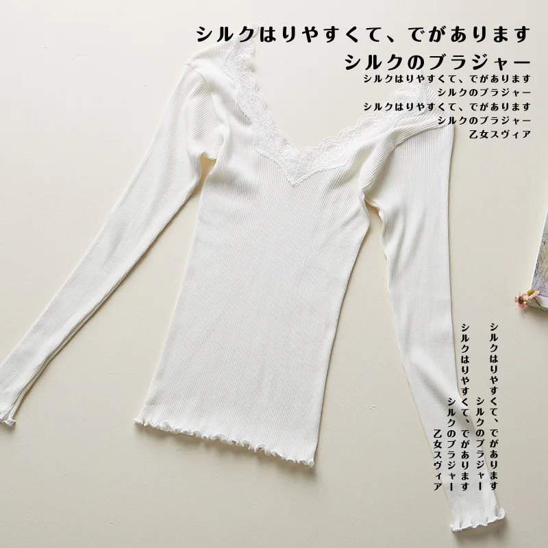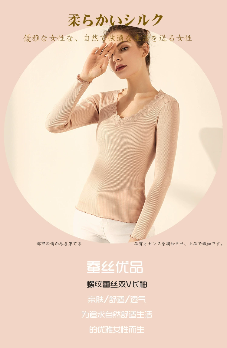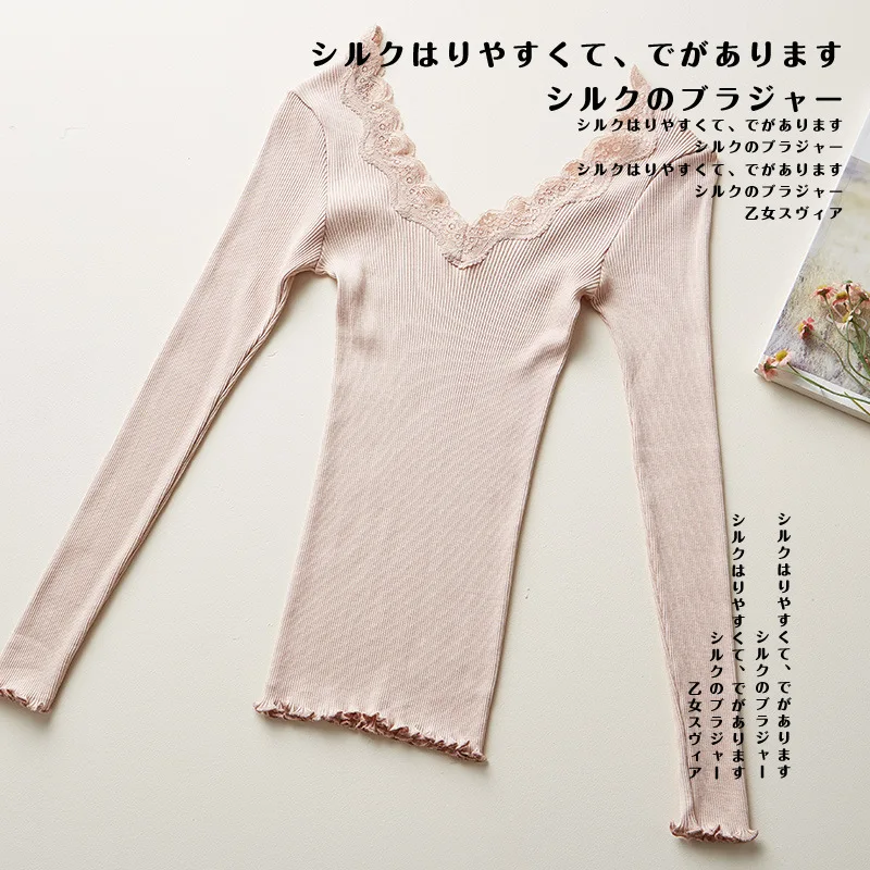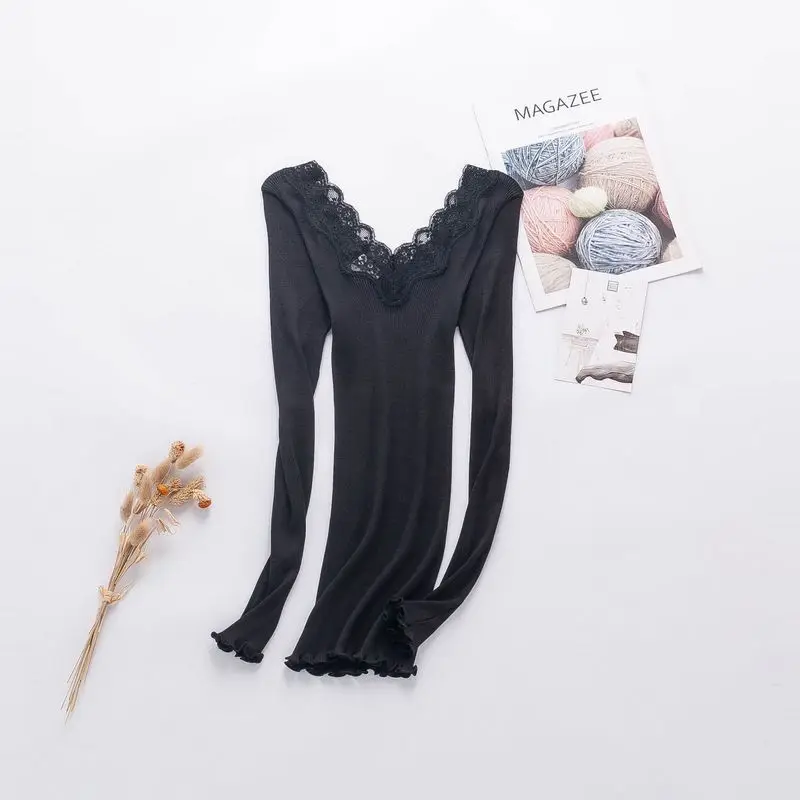 1 шт., женский Шелковый пуловер с длинным рукавом, кружевная футболка с V-образным вырезом и оборками на манжетах, Однотонная футболка в рубчик из 80% шелка тутового шелкопряда OR-52