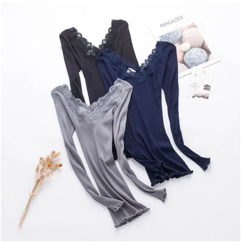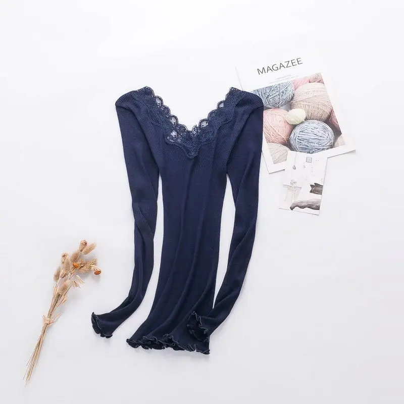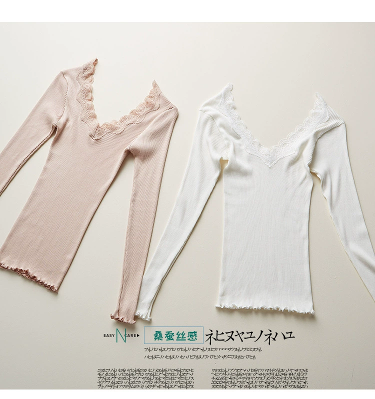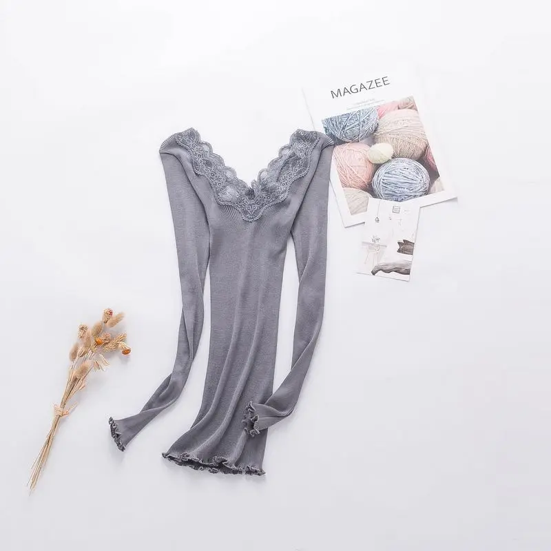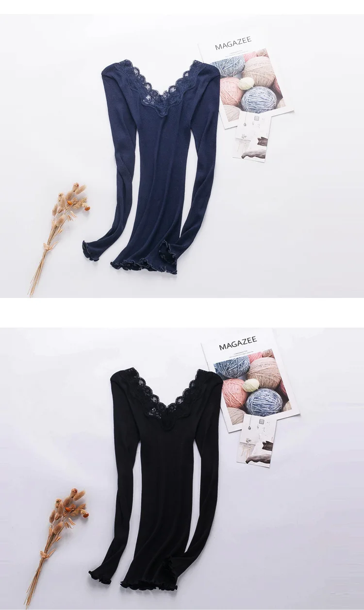 1 шт., женский Шелковый пуловер с длинным рукавом, кружевная футболка с V-образным вырезом и оборками на манжетах, Однотонная футболка в рубчик из 80% шелка тутового шелкопряда OR-52