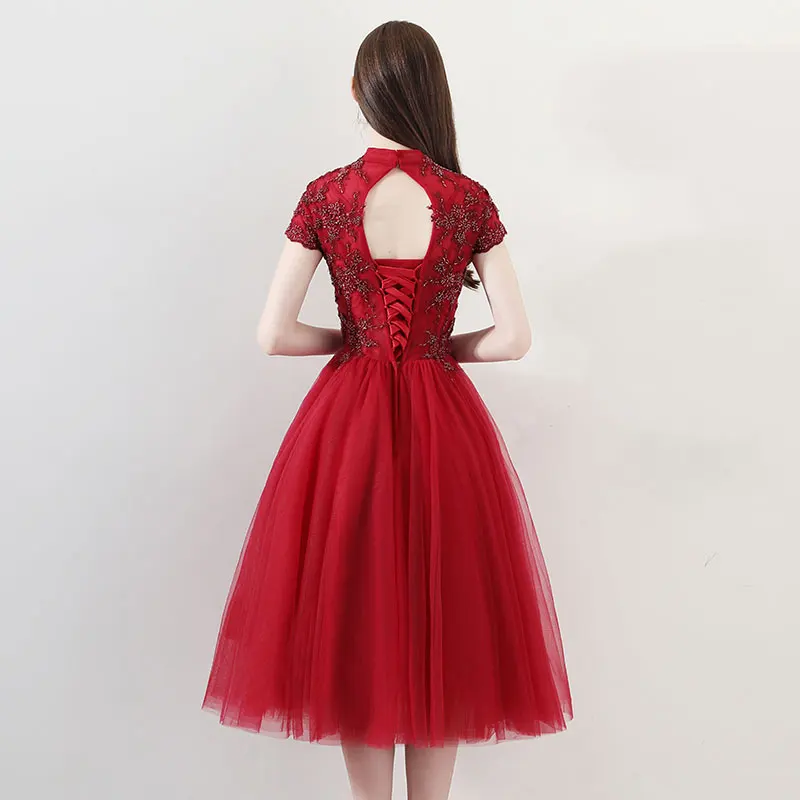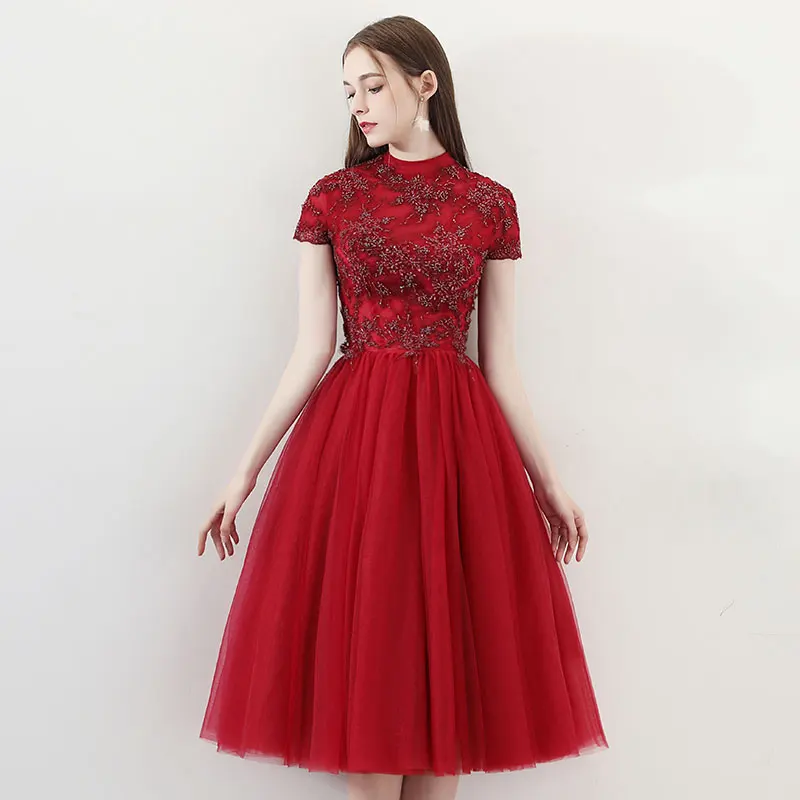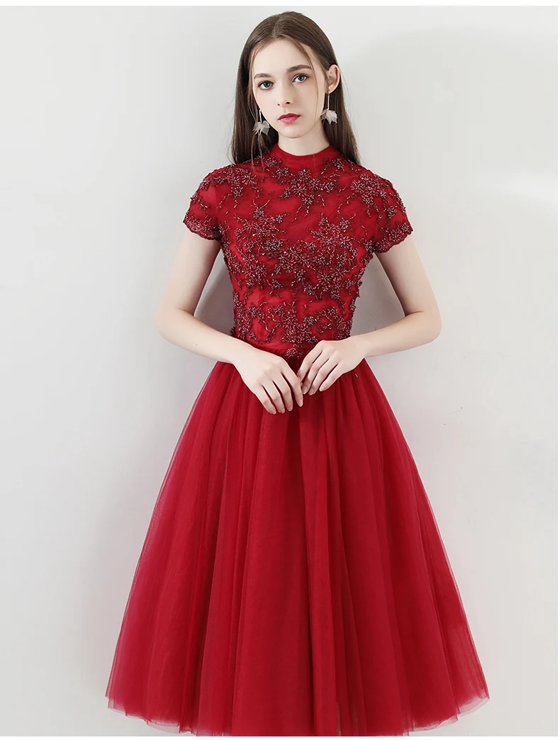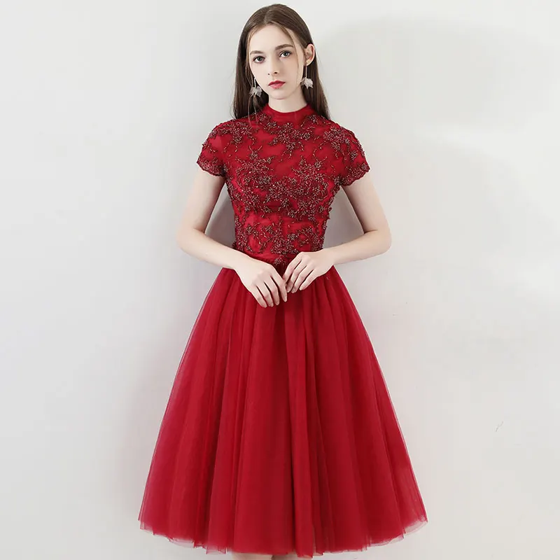 Женское вечернее платье, элегантное винно-красное платье с высоким воротом, бусинами и рукавами-крылышками, ТРАПЕЦИЕВИДНОЕ кружевное платье для выпускного вечера, 2022