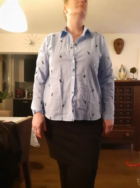 отличная рубашка , тонкий хлопок, идёт размер в размер, рукава без манжета, удобно закатывать, с джинсами самое то! рекомендую. шла больше месяца.