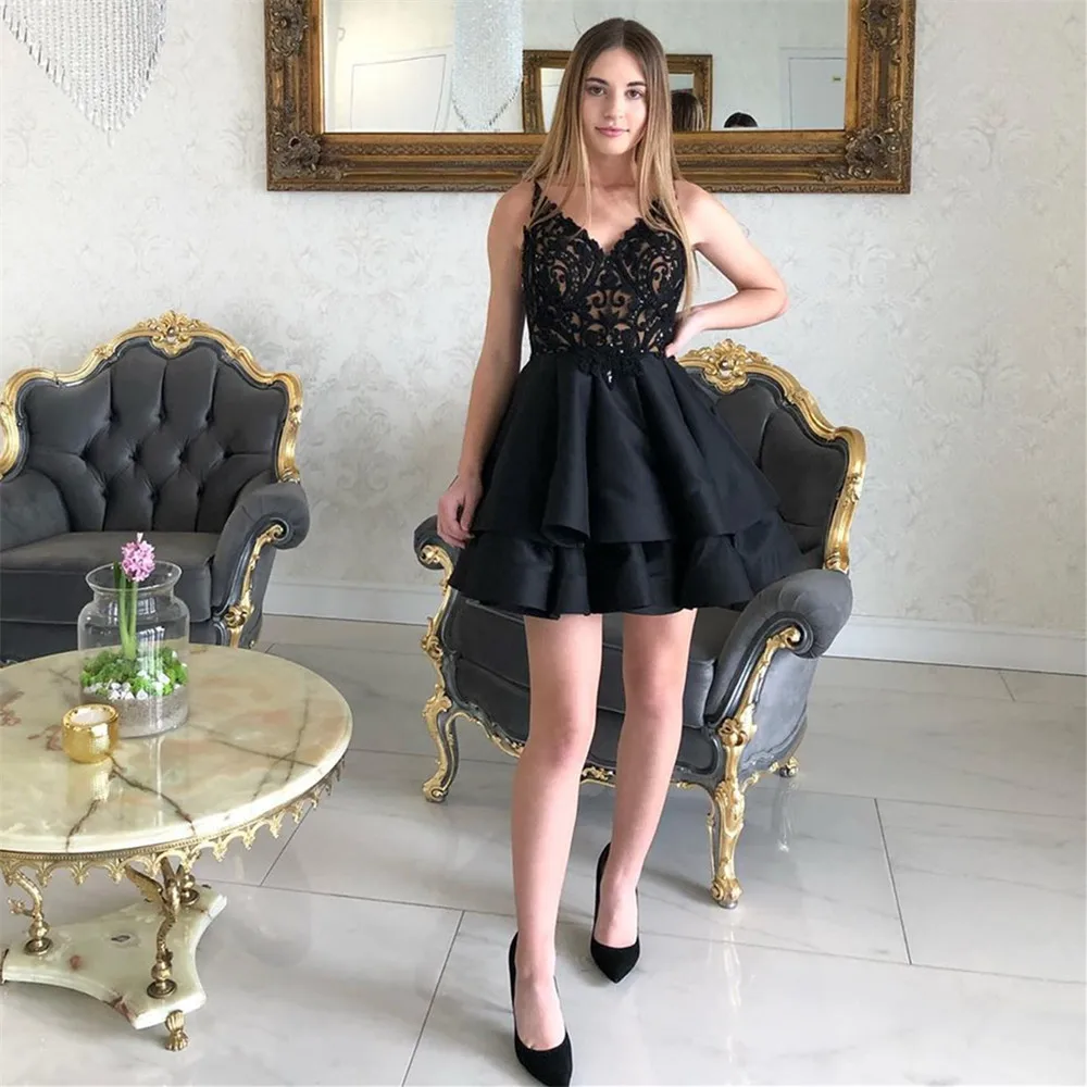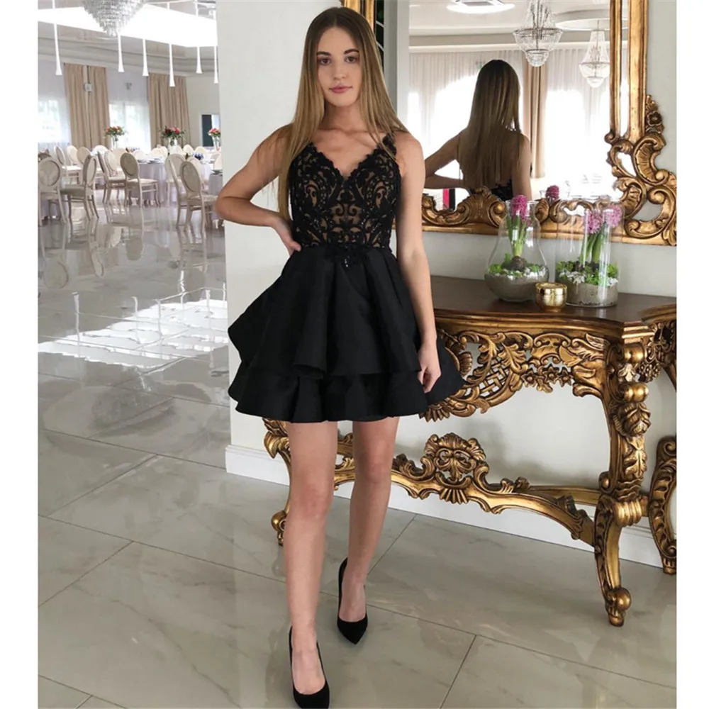 Сексуальные черные платья для встречи выпускников HONGFUYU, платья без рукавов с V-образным вырезом, коктейльное платье с градуированием, кружевное атласное Короткое Платье Для выпусквечерние вечера