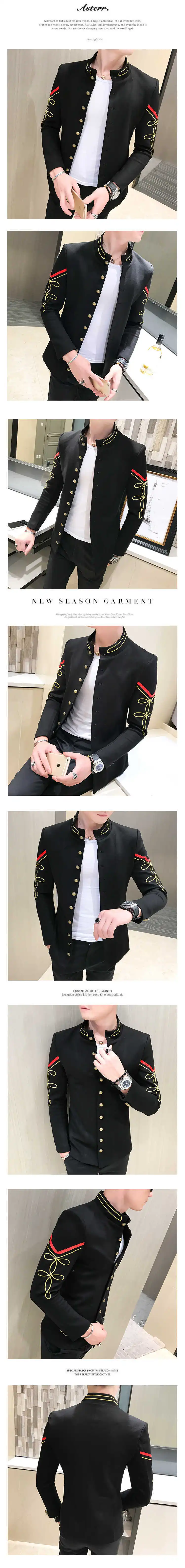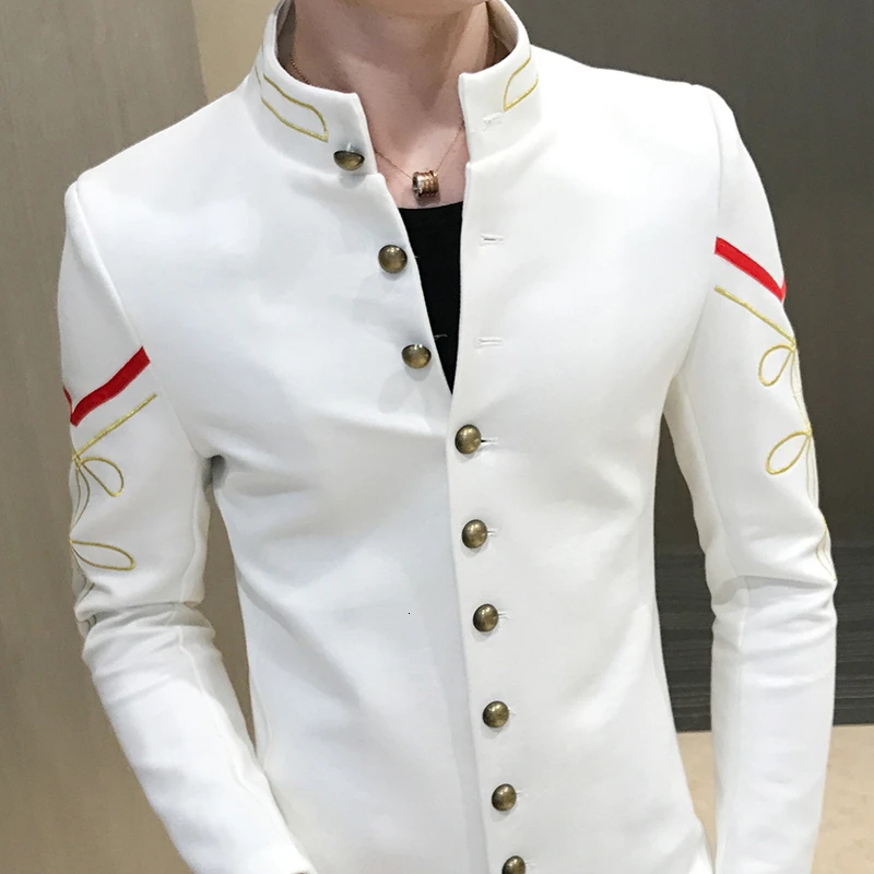 Блейзер Мужской с золотыми пуговицами и китайским воротником, приталенный пиджак-пилот в стиле милитари, чёрный синий красный белый, 4 цвета