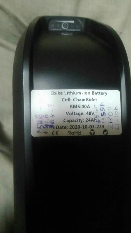 Быстрая доставка, из Москвы в Ярославль за 3 дня. Товар соответствует описанию. Зарядил до 54.1 в, разрядил не до конца, до 40.9 в., емкость получилась больше >20 Ач. смотрите фото. Можно было разряжать дальше, по описанию вплоть до 36.4. Если полностью заряженый разрядить, выйдет порядка 24 Ач. Ячейки стоят 21700, 65 шт. корпус хороший, но ездить с таким креплением только по хорошему асфальту, иначе на ямах рзболтается, вес большой слишком. Буду делать свое крепление. С низу имеется алюминиевый радиатор для установки контроллера. Вобщем - покупать можно.