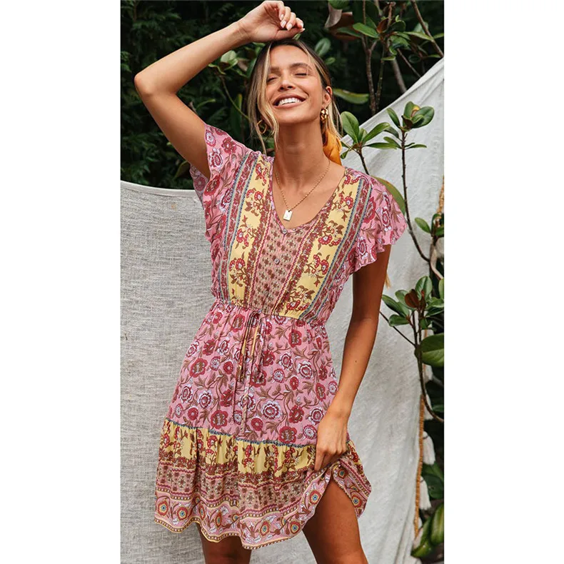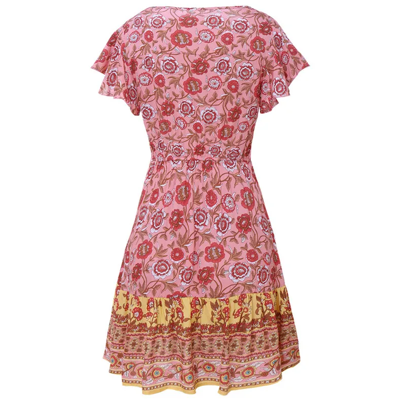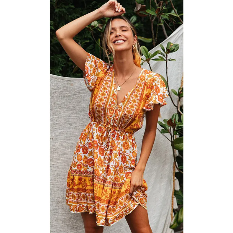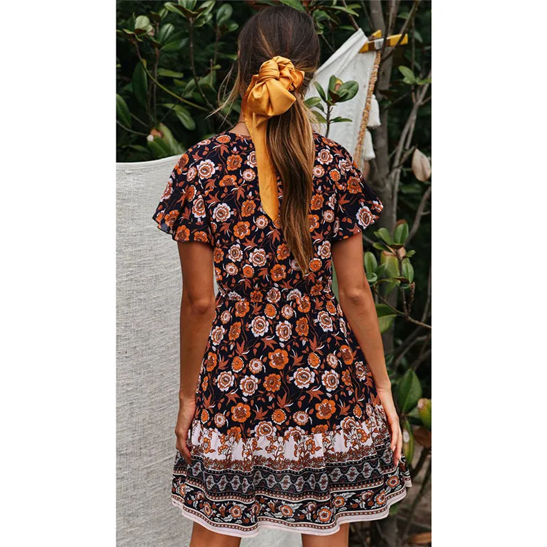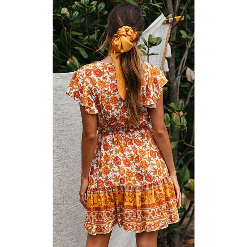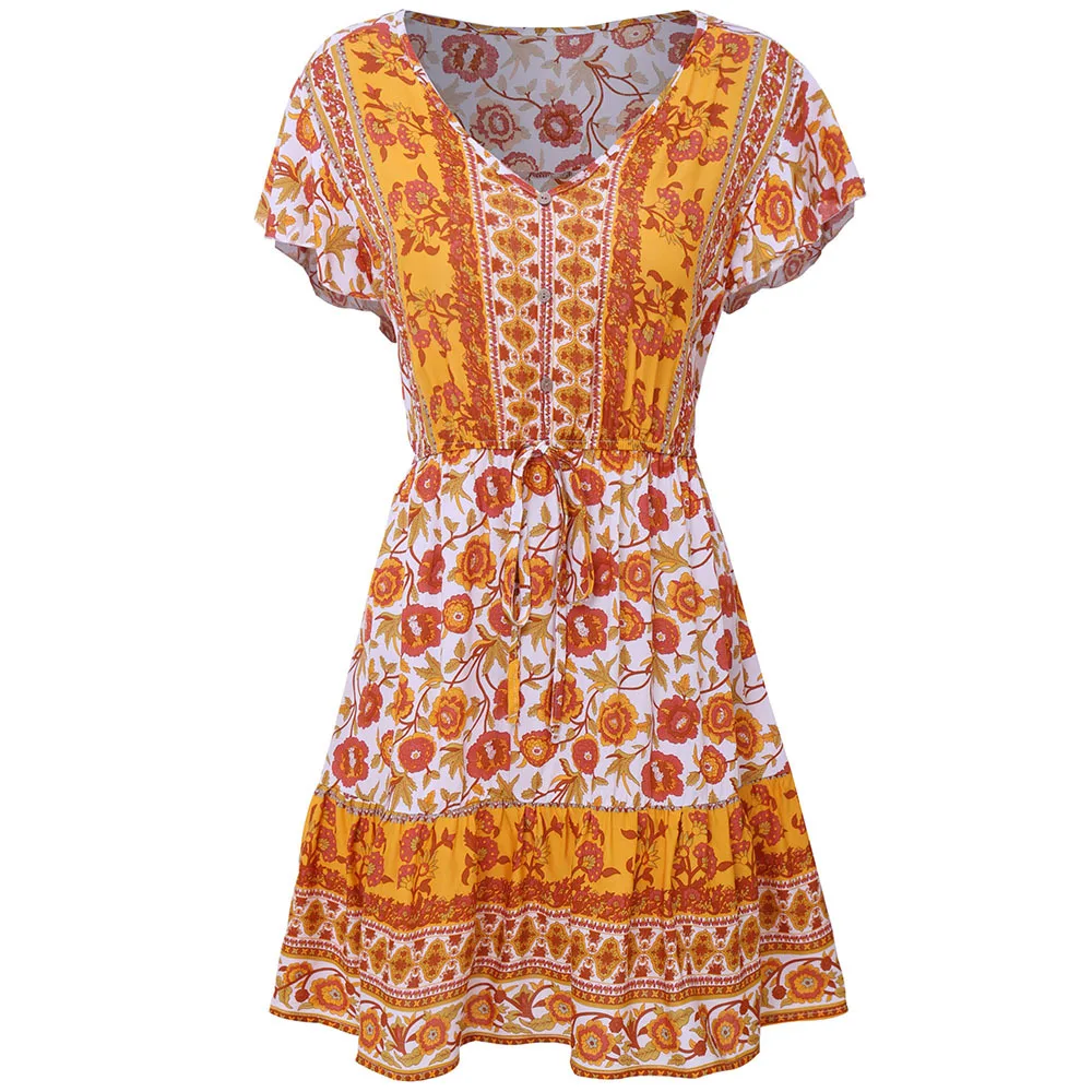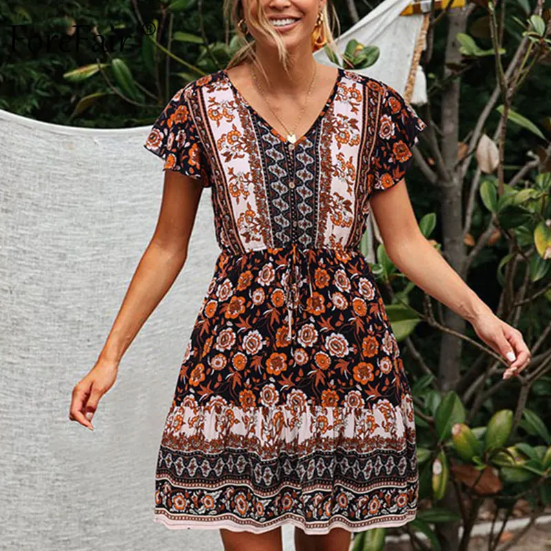 Женское короткое платье с цветочным принтом Forefair, летнее пляжное платье в стиле бохо с завязками на талии и v-образным вырезом