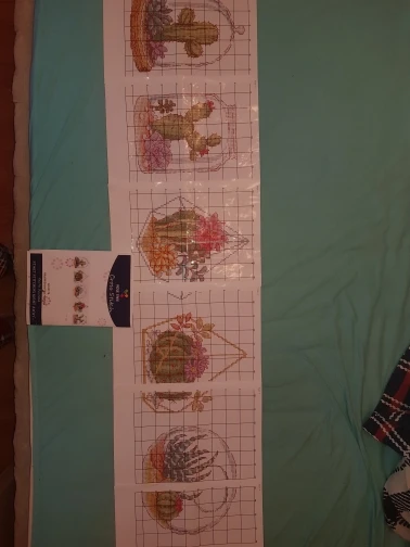 Рисунок на схеме не соответствует рисунку на картинке. нарушается симметричность рисунка. схема напечатана на супер глянцевой бумаге, ближе к фото бумаге, жутко отбликивает, невозможно направить нормально свет. не понятно почему некоторые кактусы "разорвали" на 2 листа. 1 кактус чётко влезает на 1 лист