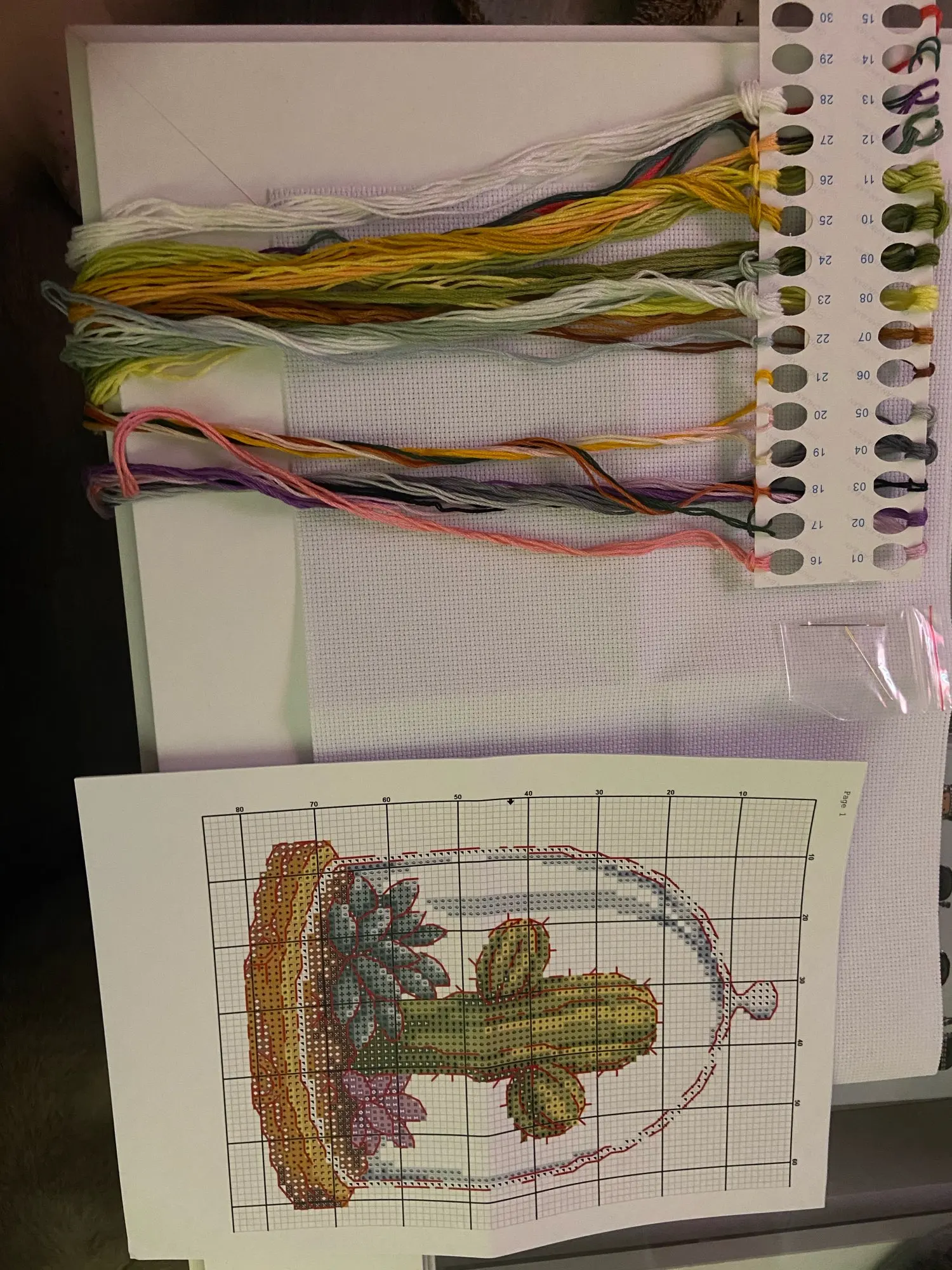 I am very pleased with the package I received. Received 2 needles, aida, cotton floss, and pattern. Very good instructions even if you are a beginner. Materials have good quality and collors have the dmc correspondent number. Thank you seller.