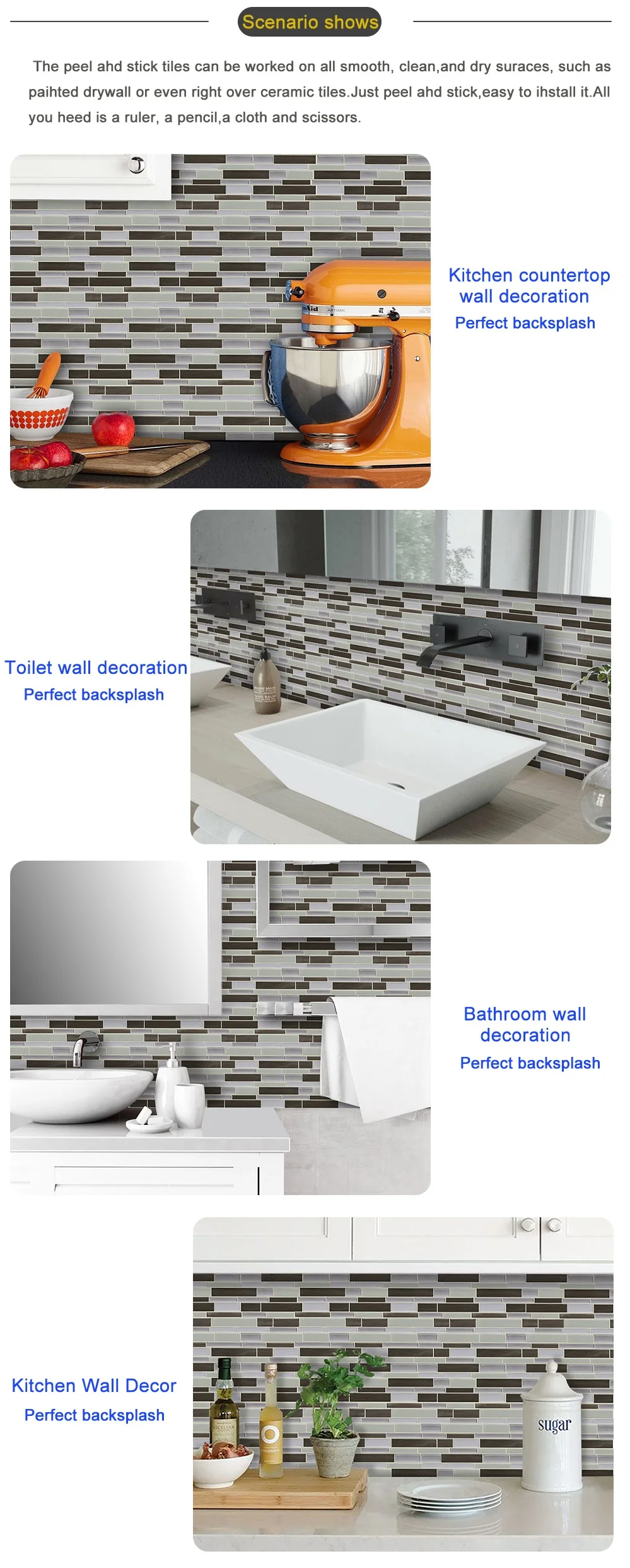 Плитку можно легко установить прямо на существующие панели или на гладкую поверхность. Специально разработан для кухонного щитка и щитка ванной комнаты, плитка устойчива к нагреву печей и влажности ванных комнат.