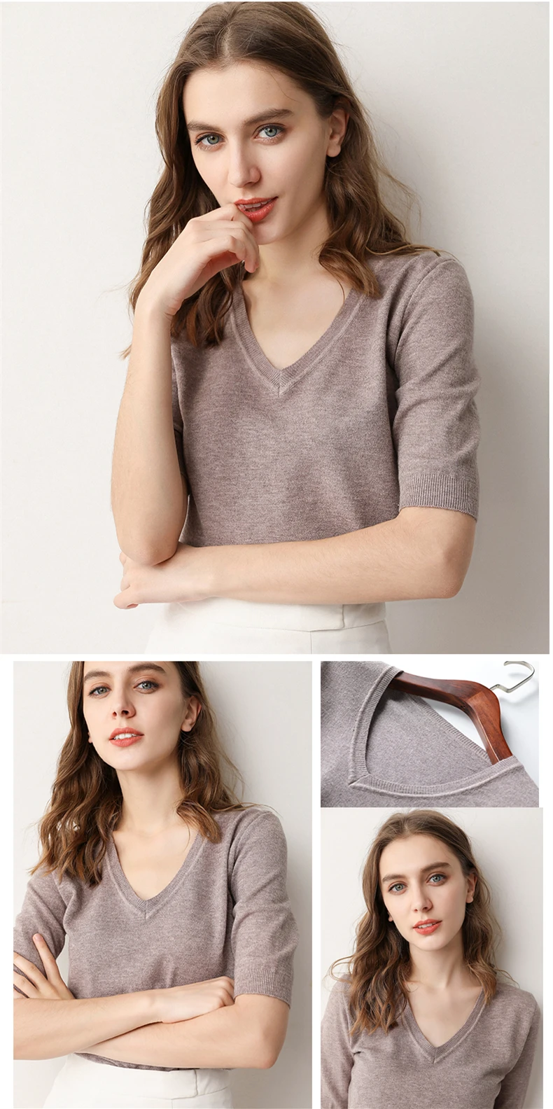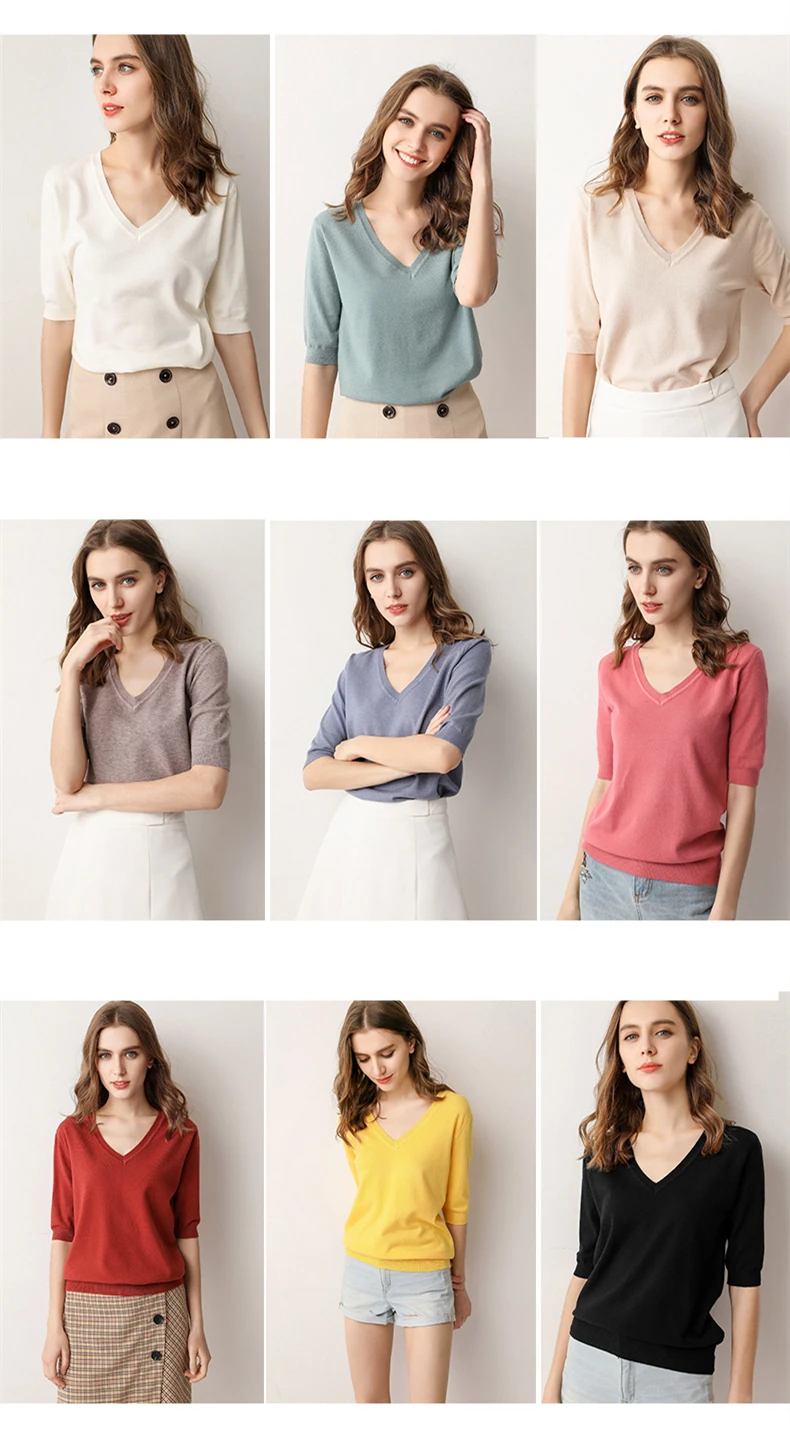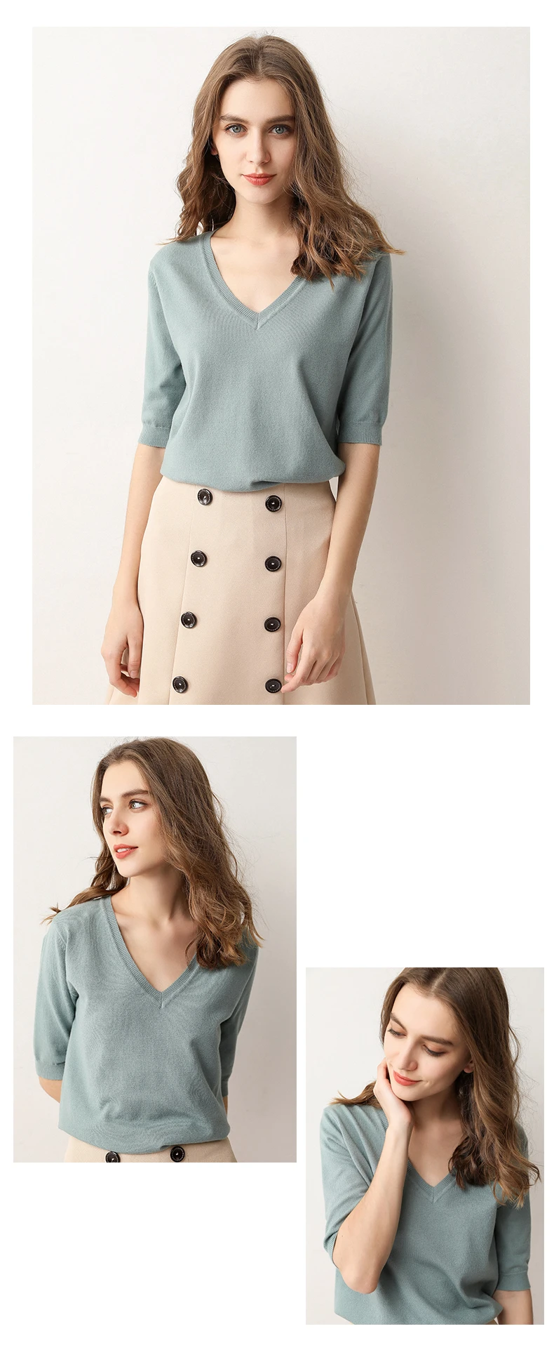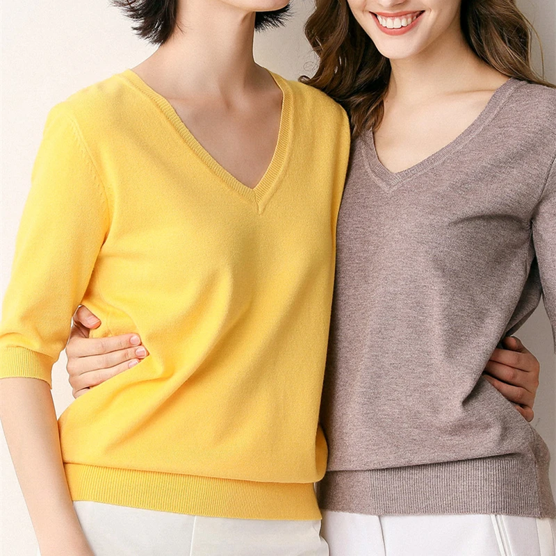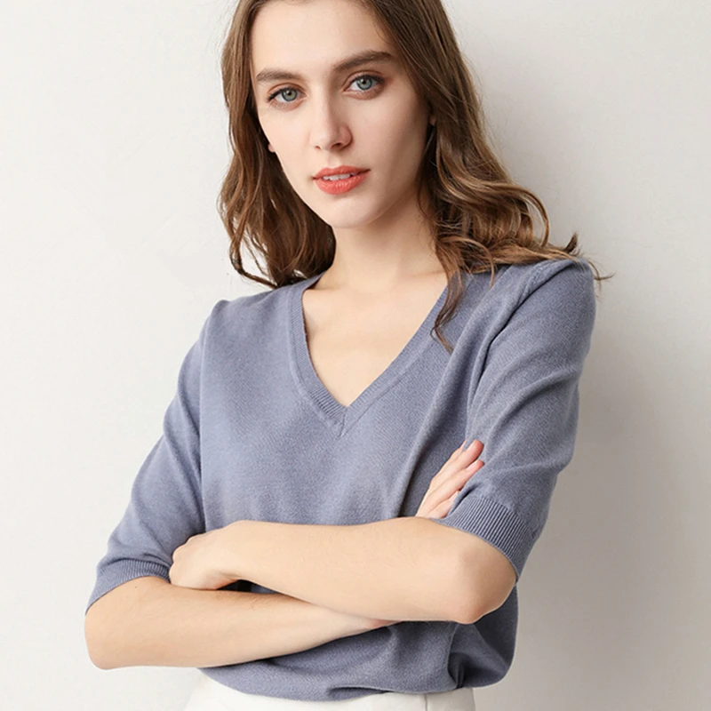Свитер женский трикотажный однотонный, пуловер с V-образным вырезом и рукавом до локтя, тонкий мягкий облегающий Повседневный свитер, весна-лето
