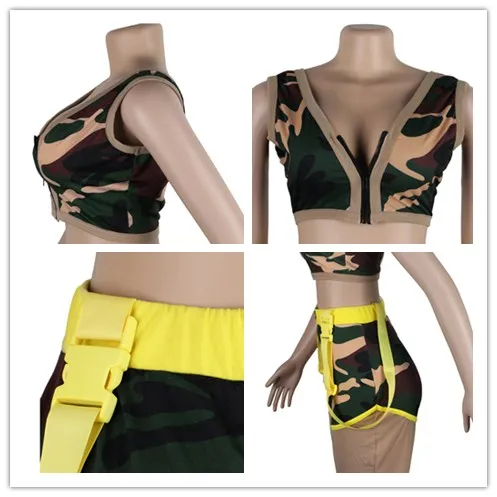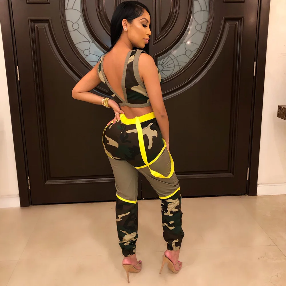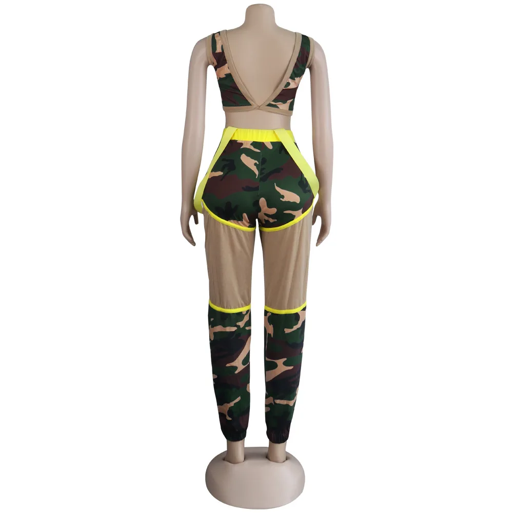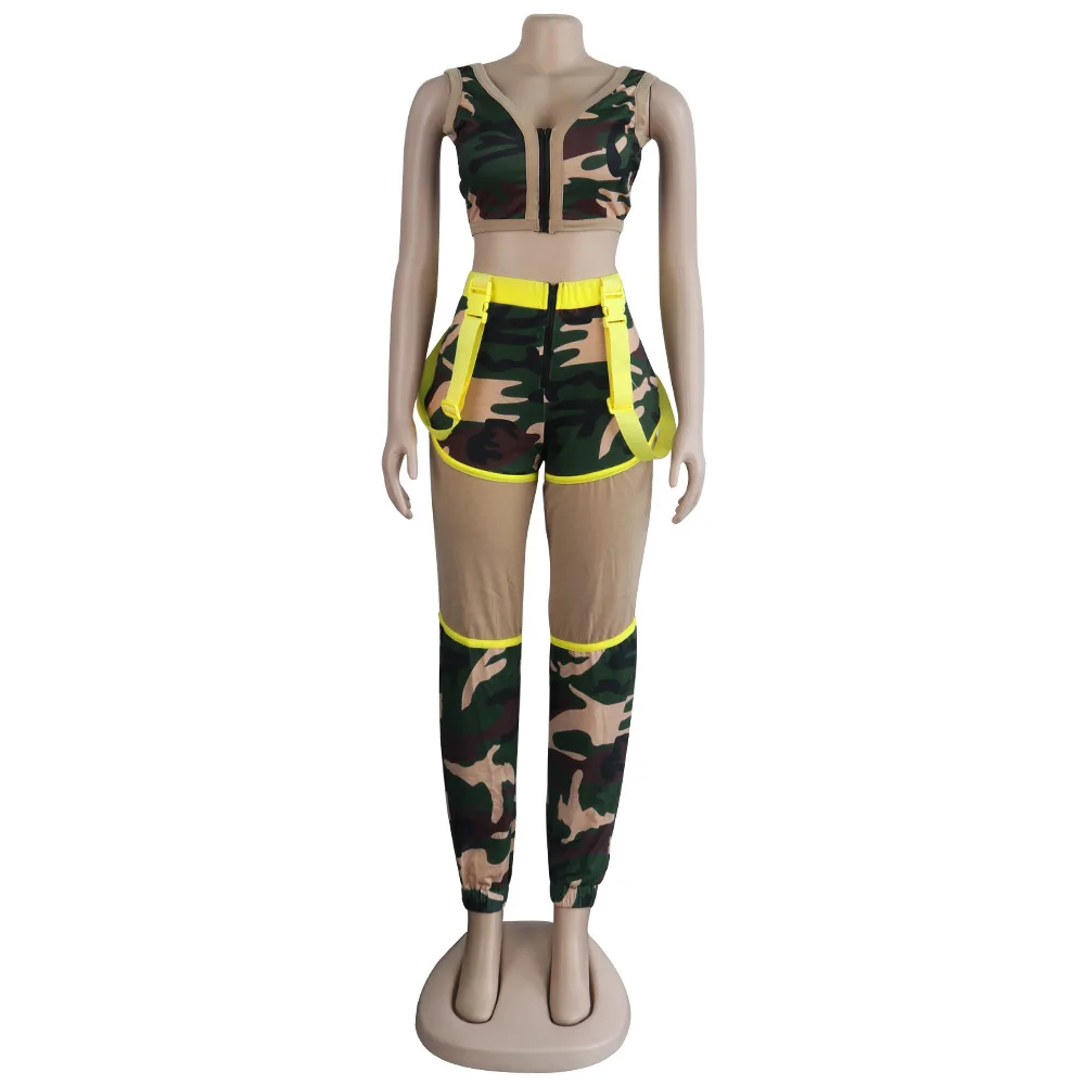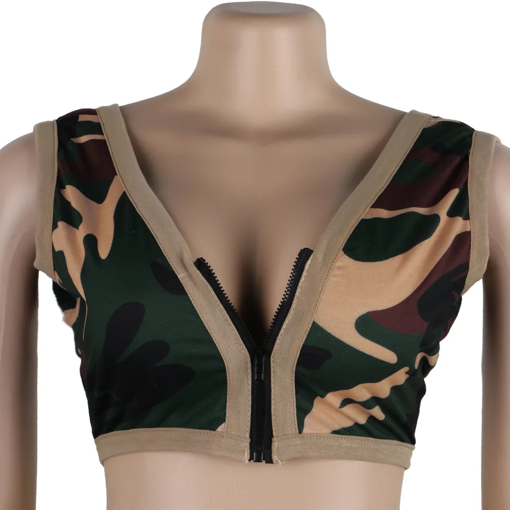 Женский Камуфляжный комплект из двух предметов, повседневный укороченный топ на молнии с V-образным вырезом и без рукавов, жилет, комбинезон на бретельках, брюки, костюм, женский наряд, спортивный костюм