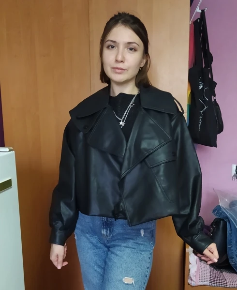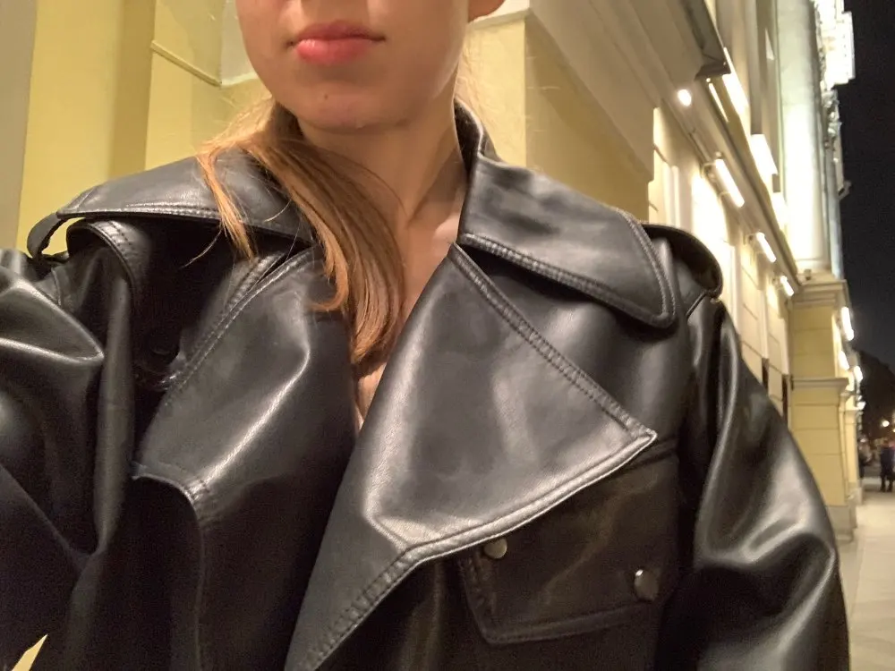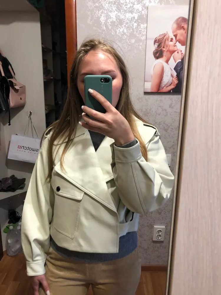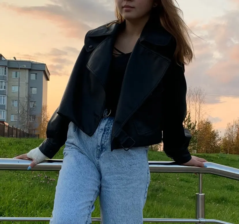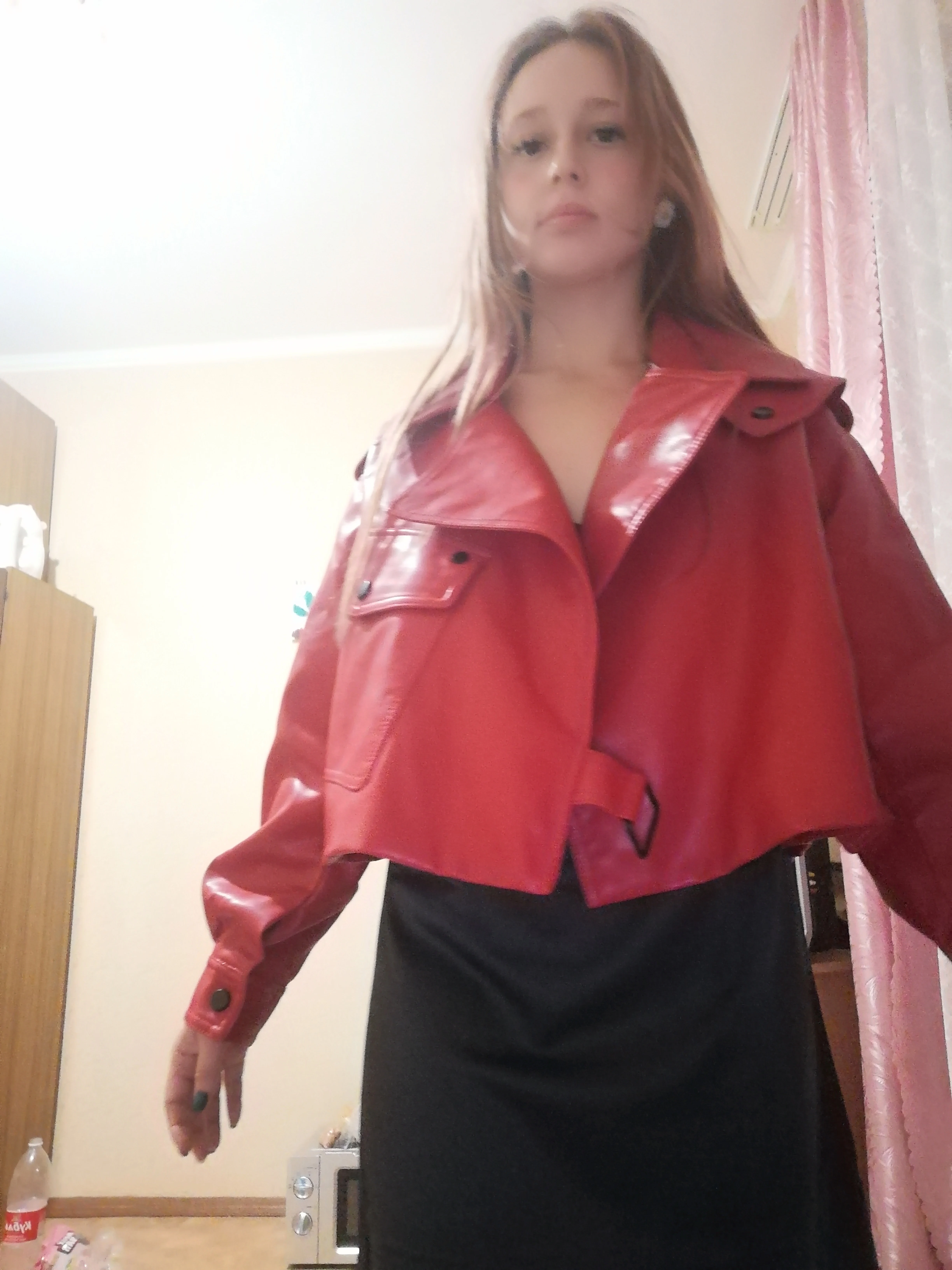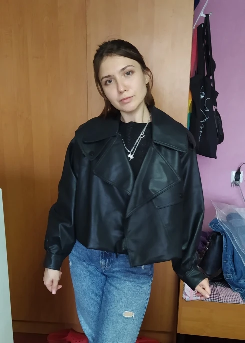 Куртка в точности как на фото. Конечно видно, что это не кожа, но кожзам ооочень мягкий. На 86/69/92 размер s подошел отлично, оверсайз как я и хотела
