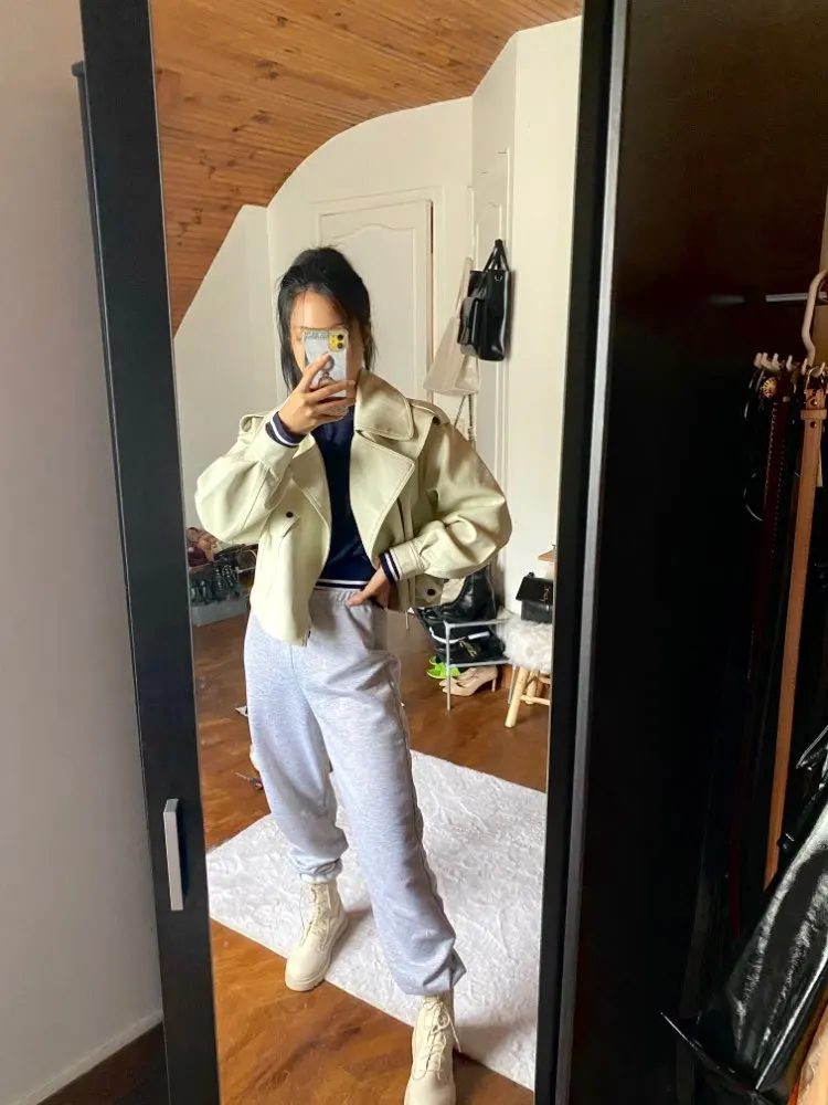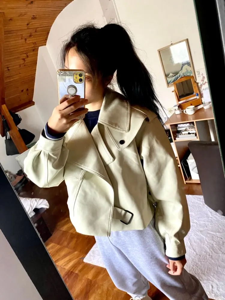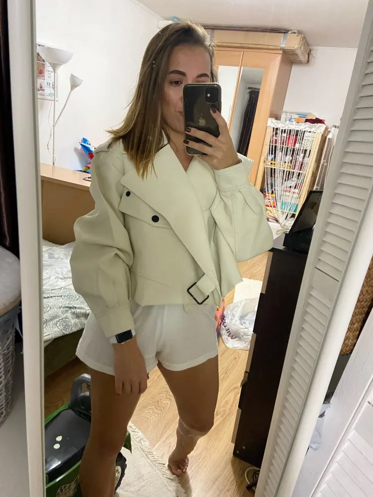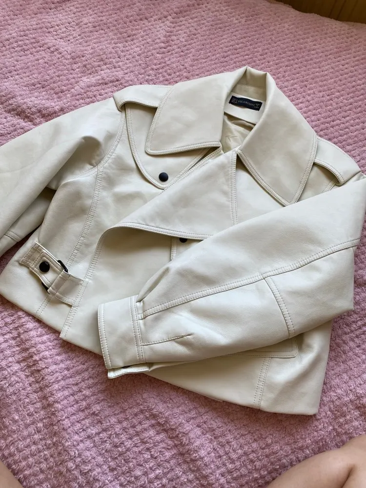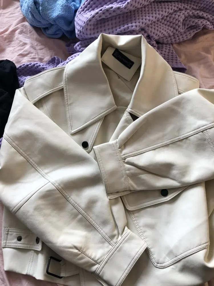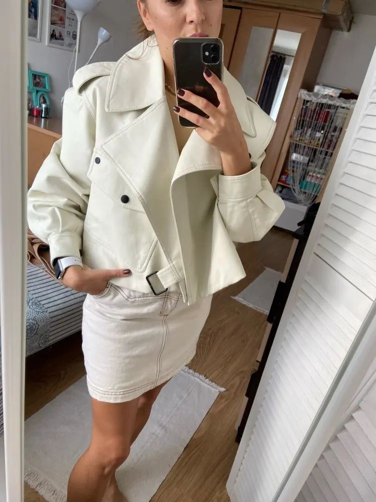 Куртка в точности как на фото. Конечно видно, что это не кожа, но кожзам ооочень мягкий. На 86/69/92 размер s подошел отлично, оверсайз как я и хотела
