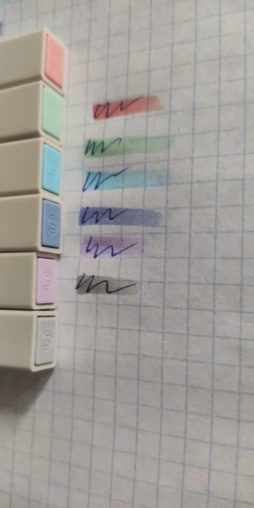 По размерам очень компактные, думала они будут больше - специально сравнила с другой ручкой, чтобы было наглядно) Пришли быстро, стержни твёрдые, можно при желании писать уголком и выводить им тонкие линии. Цвета сняла со вспышкой и без, они приятные глазу и не перекрывающие ручку, как и хотелось.