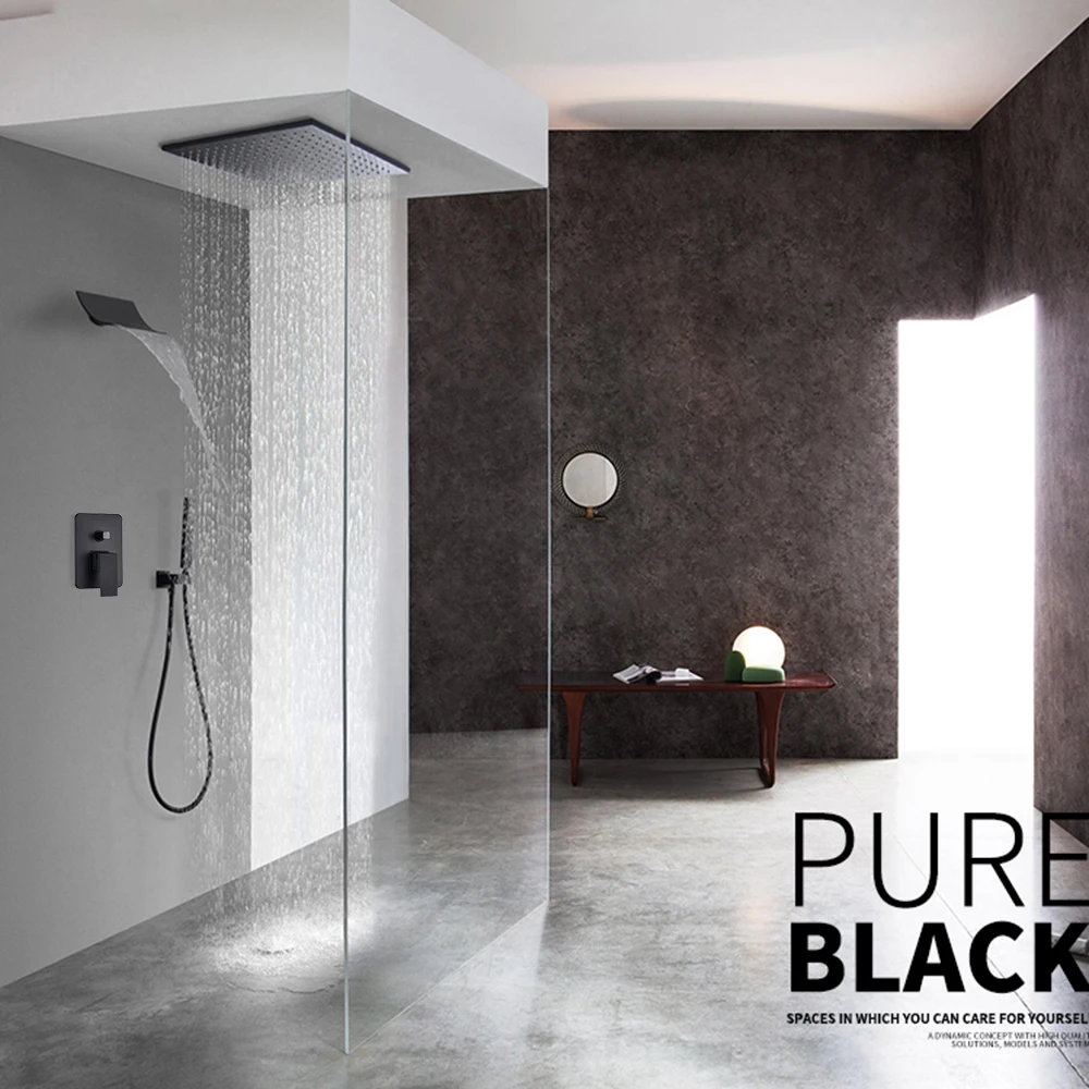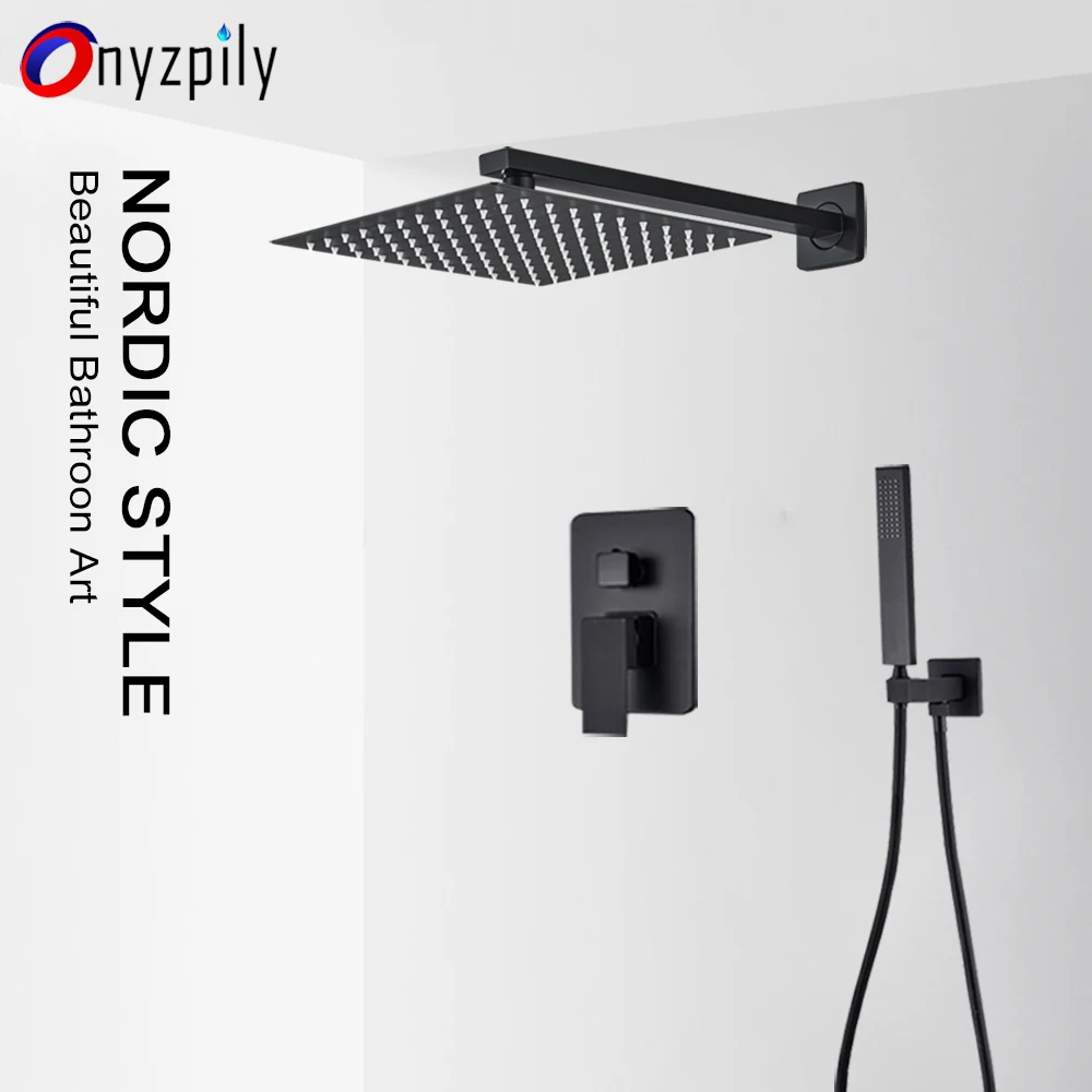 Матовый черный 8 дюймов 10 дюймов настенный смеситель для душа для ванной комнаты смешанный смеситель для горячей и холодной воды со встроенным клапаном управленияФункция: смесители для душаСтиль: СовременныйДушевая лейка: дождь, ручнойКоличество ручек: одна ручкаТип клапана: Керамический клапанМатериал душевой лейки: латуньМатериал ручки для душа: ABSРазмер душевой лейки: 8 "10" 12 "16"