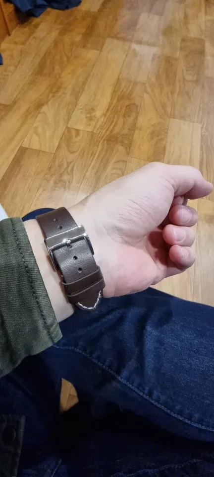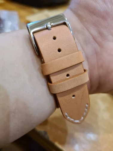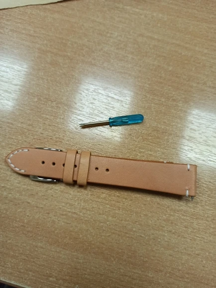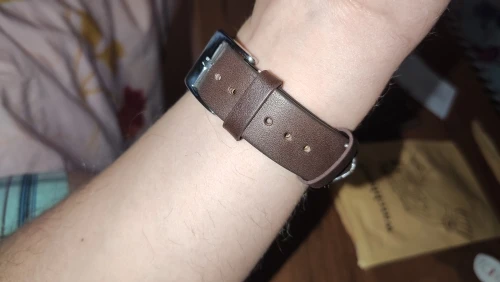 Доставка 20 дней. Упаковано хорошо, очень трудно повредить. Цвет соответствует. Сам ремешок пахнет кожей, приятный на ощупь, довольно мягкий, особенно после родного (Huawei GT), в часы встал идеально. Длиннее родного, у меня не самая толстая рука, но и не супертонкая: родной застегивал на среднюю дырку, этот пришлось на самую максимальную. Но есть проблема: ремешок сделан из двух слоев кожи, склеенных между собой, и в итоге при первом же использовании расслоился (см. фото). Попробую проклеить клеем для обуви