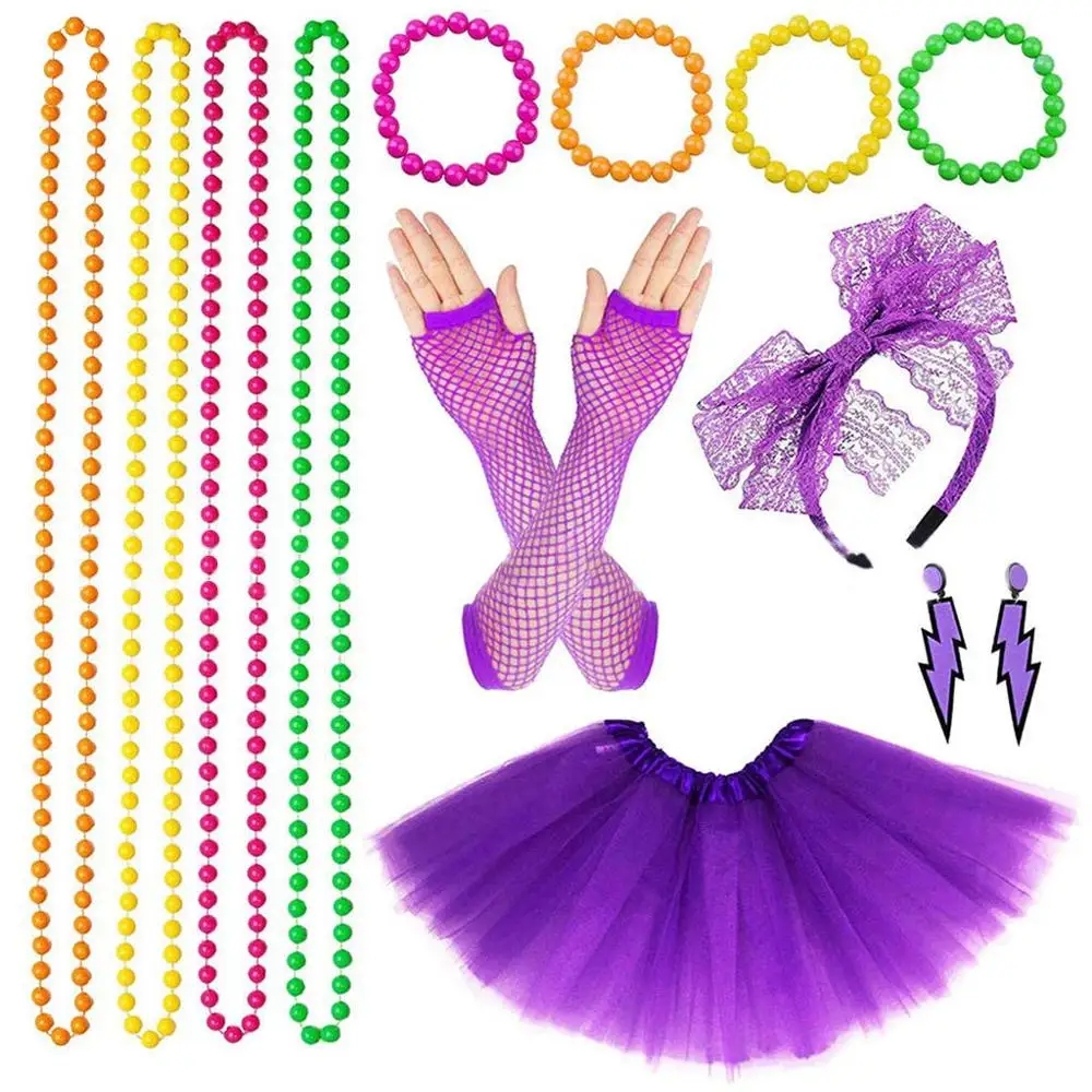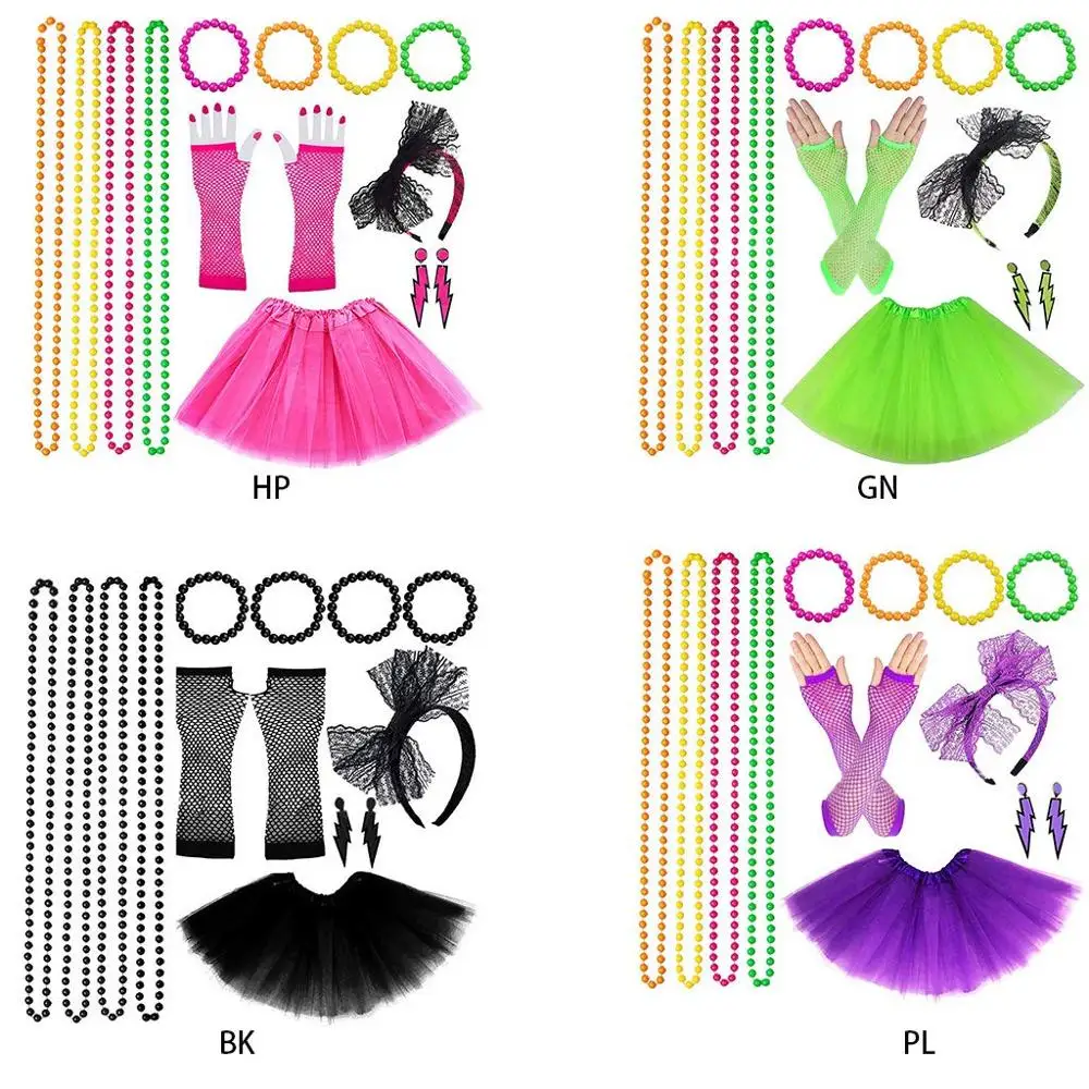 Женские 1980s юбка-пачка ажурные перчатки гетры Цепочки и ожерелья 80s неоновый костюм Курочка partya