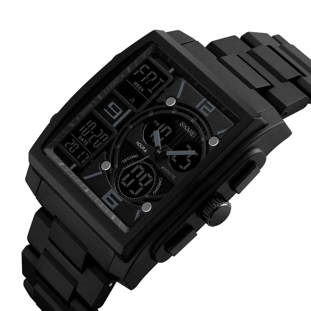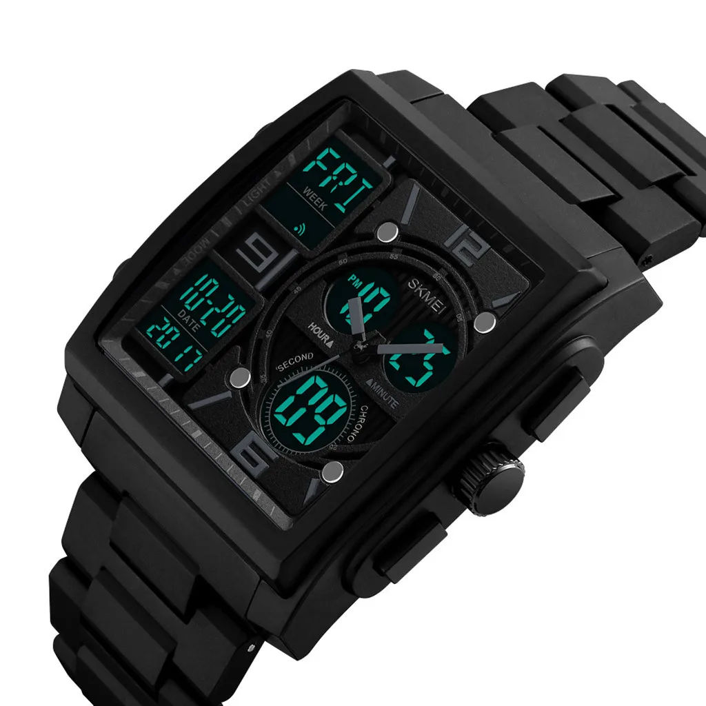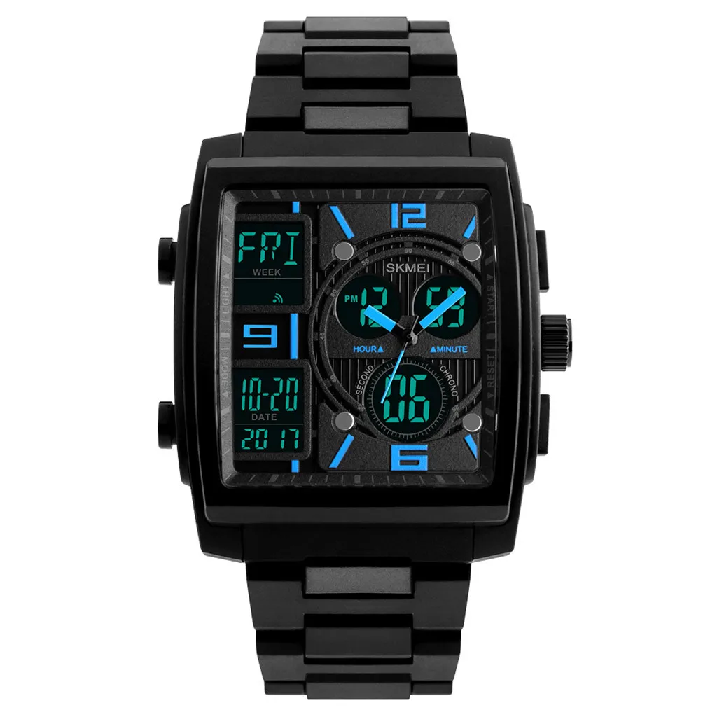 Бренд: SKMEI Авторизован владельцем бренда, гарантия качества Мягкий ПУ резиновый ремешок для часов Чехол для часов из высококачественного ПК Стекло для часов из смолы высокой четкости Пряжка для часов из нержавеющей стали Механизм: кварцевый аккумулятор Стильный Прямоугольный циферблат Аналоговый и цифровой дисплей Многофункциональность: время/дата/Будильник/неделя/секундомер EL светильник вой дисплей, видимый в темноте Набор из 3 часовых поясов, красивый дизайн Поддержка настройки ч Водонепроницаемость 50 м. Не нужно снимать во время плавания (избегайте горячей/теплой воды) Хороший подарок для себя и друзей, добро пожаловать за покупкойСпецификация: