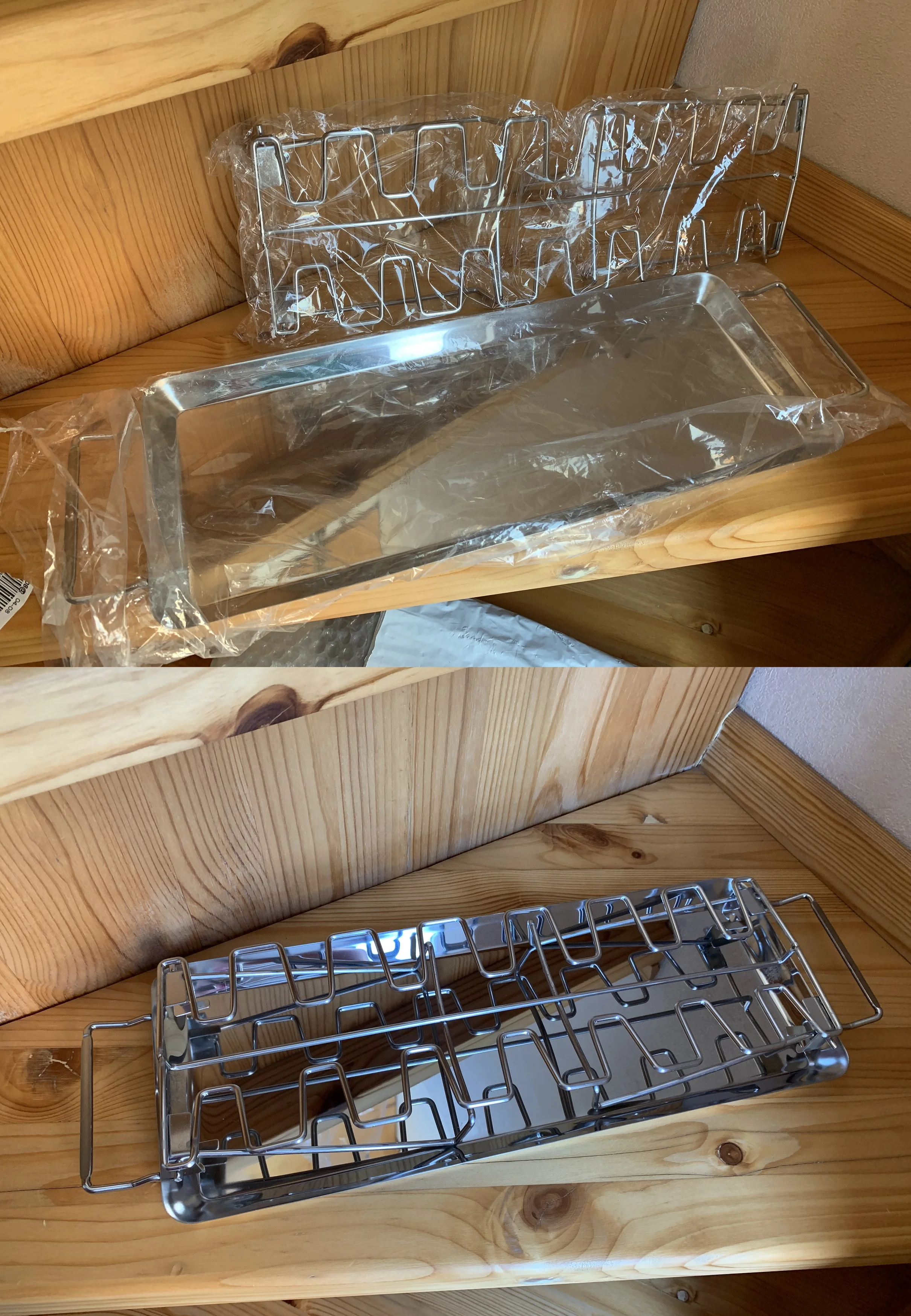 Заказала из Росии, но продавец написал, что нет на складе и предложил отправить из Китая. После моего подтверждения дал трекномер. Ехала посылка месяц. Курьер привёз заказ домой. Упаковка слабовата. По бокам поднос поцарапался. Длина подноса с ручками 43,8 см, без ручек 36,8 см на 14,6 см на 1,5 см. Длина жаровни 35 см, высота 14,4 см, ширина 11,4 см. У меня поднос в духовку не помещается - мешают ручки. Если их отломать, то встанет. У меня ручки прикрепили крепко. Пришлось ставить в духовку жаровню на поднос от плиты. Когда будете готовить на поднос надо налить стакан воды, чтобы не горел жир который будет капать с окорочков. Жарила окорочка в духовке при температуре 200 градусов 40 минут. Вытащила жаровню из духовки и поставила на поднос, который был в комплекте. На нём хорошо подавать на стол. Смотрится оригинально. Окорочка получаются сочные, с хрустящей корочкой.