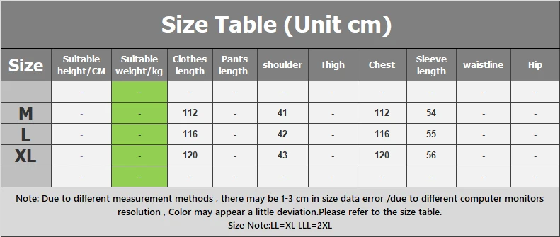 Таблица размеров (единица см)РазмерыПодходящая высота/смПодходящий вес/кгДлина одеждыДлина брюкПлечоБедраГрудьДлина рукаваЛиния талииБедра----------М--112-41-11254--L--116-42-11655--XL--120-43-12056------------Примечание: Из-за различных методов измерения возможна погрешность в размере 1-3 см/из-за различий в разрешении компьютерных мониторов цвет может немного отличаться. Пожалуйста, обратитесь к таблице размеров.Примечание по размеру: LL = XL LLL = 2XL