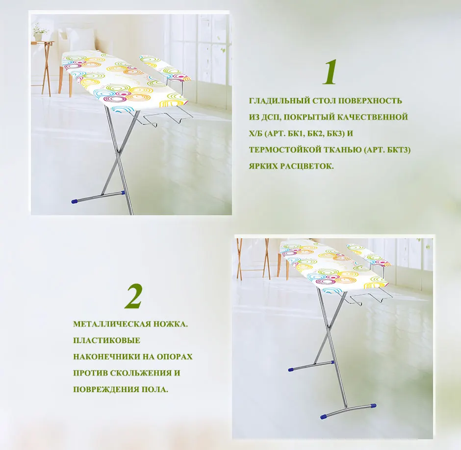 "1、Гладильный стол поверхность из ДСП, покрытый качественной х/б (арт. БК1, БК2, БК3) и термостойкой тканью ярких расцветок.2、металлическая ножка.3、Пластиковые наконечники на опорах против скольжения и повреждения пола.4、Плавная регулировка высоты до 0,7 и 0.8 м.5、 Выдвижная подставка под утюг.6、Подрукавник съемный."