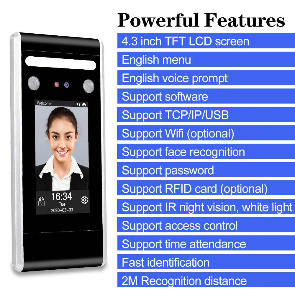 1) 4,3 дюймовый цветной ЖК-экран TFT. Изготовлена из высококачественного материала.2) работает с 12 В постоянного тока и поставляет вилку питания 12 В постоянного тока.3) имеет инфракрасный свет ночного видения высокого разрешения и профессиональный цвет Двойная камера, может провести быструю проверку в любой обстановке.4) Двойной источник светильник (2 инфракрасных луча + светильник). Можно распознать даже в темное время суток.5) скорость идентификации 0,1 с, очень быстрая! Поддержка расстояния обнаружения лица 0,5-2 метра.6) Работа с частотой 125 кГц и 13,56 мгц. Поддержка карт EM и Mi-fare.7) Поддержка 2000 распознавания лиц, 2000 пароля, 2000 RFID-карт (опционально), 200000 записи.8) поддерживает распознавание лица, пароль, RFID-карты и различные способы комбинирования, чтобы удовлетворить потребности разных пользователей. (необязательно)9) редакторы методов ввода T9, на название машины, отдел, частоту и другую информацию, могут непосредственно выводить отчеты о посещаемости, очень просты в эксплуатации.10) Поддержка способа связи WIFI / TCP/ IP. Поддержка USB-флеш-накопителя загрузка данных посещаемости загрузки. (Необязательно)11) имеет Wiegand26/34 вход/выход, TTL вход/выход, релейный выход12) Поддержка английского меню и гуманизированных голосовых подсказок.13) подходит для входов и выходов в офис, фабрику, гостиницу, школу и т. Д.