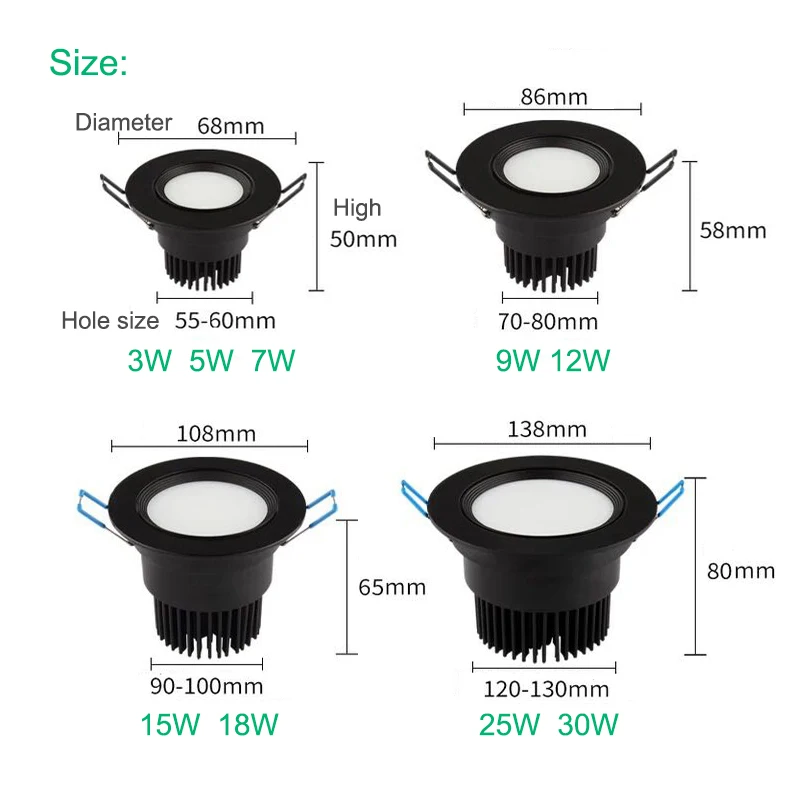 Затемнения светодиодный вниз светильник COB Точечный светильник потолочный светильник 5W7W9W12W15W18W25W30W Круглый Встраиваемый светодиодный вниз светильник панели светильник AC110V 220V