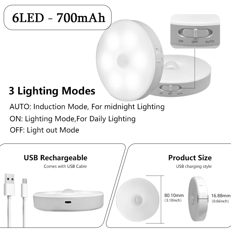 Светильник выполнен качественно, светодиодов шесть, светят очень ярко. Крепится либо непосредственно на скотч 3М, который идёт в комплекте, либо на скотч к стене крепится металлическая площадка (тоже идёт в комплекте), а уже к ней примагничивается светильник. Второй вариант удобнее в плане зарядки - снял, зарядил, вернул на место. Три режима работы - постоянно включен (ON), выключен (OFF) и режим с датчиком движения (AUTO), выбор режима осуществляется при помощи механического переключателя. Обещанный радиус действия датчика в 3-5 метров на практике составляет скорее 2-3 метра, но и этого с головой достаточно в ванной комнате, для ночных походов в которую он собственно и покупался. Два режима индикатора зарядки - идёт зарядка (красный светодиод), зарядка окончена (светодиод не горит). К светильнику прилагается USB-кабель для зарядки. Свет действительно очень мягкий и не режет глаза даже спросонья в полной темноте. Покупкой очень доволен.