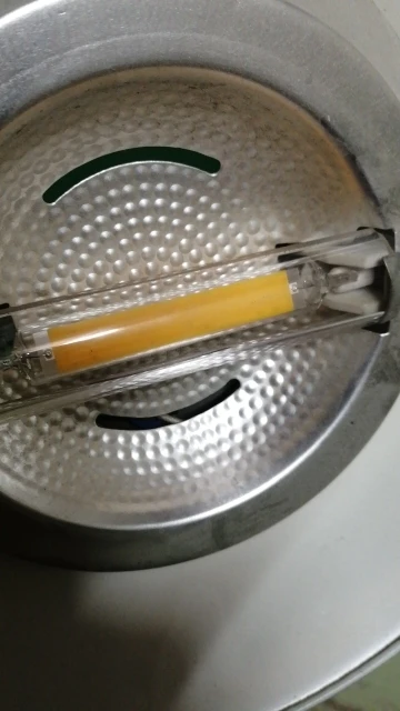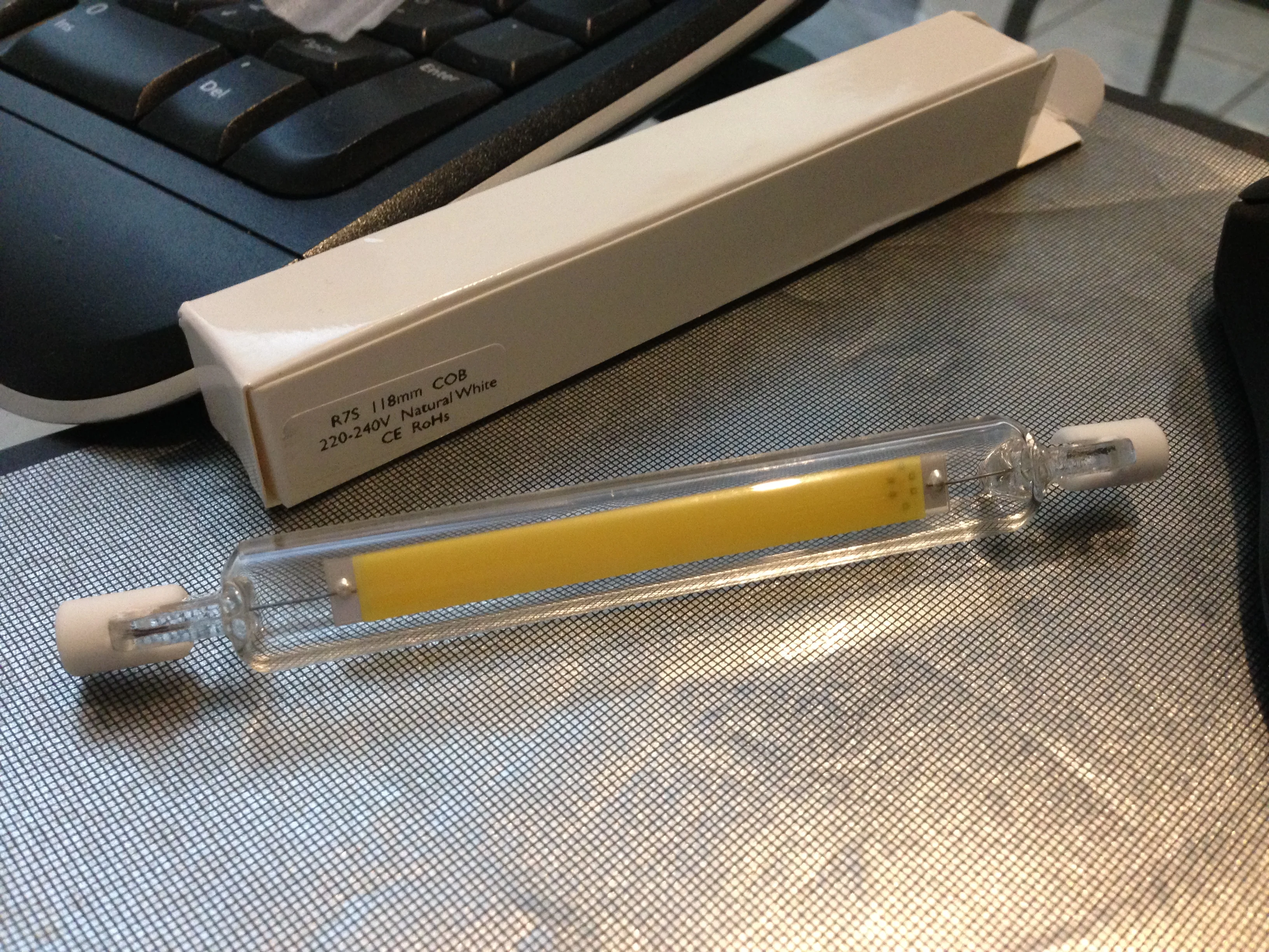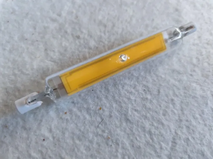Эти трубки просто соответствуют их спецификациям, и это очень хорошая точка. Продавец рекламирует 20 Вт, и я измерил 17 Вт на обоих образцах, которые я заказал (230 В и 74 мА переменного тока). Это не так плохо, и яркость сопоставима с галогенной трубкой мощностью 150 Вт.