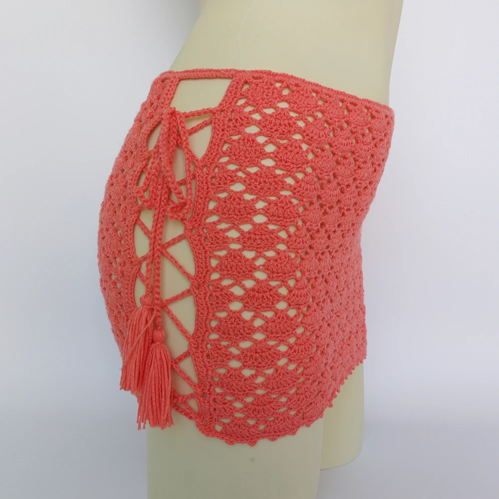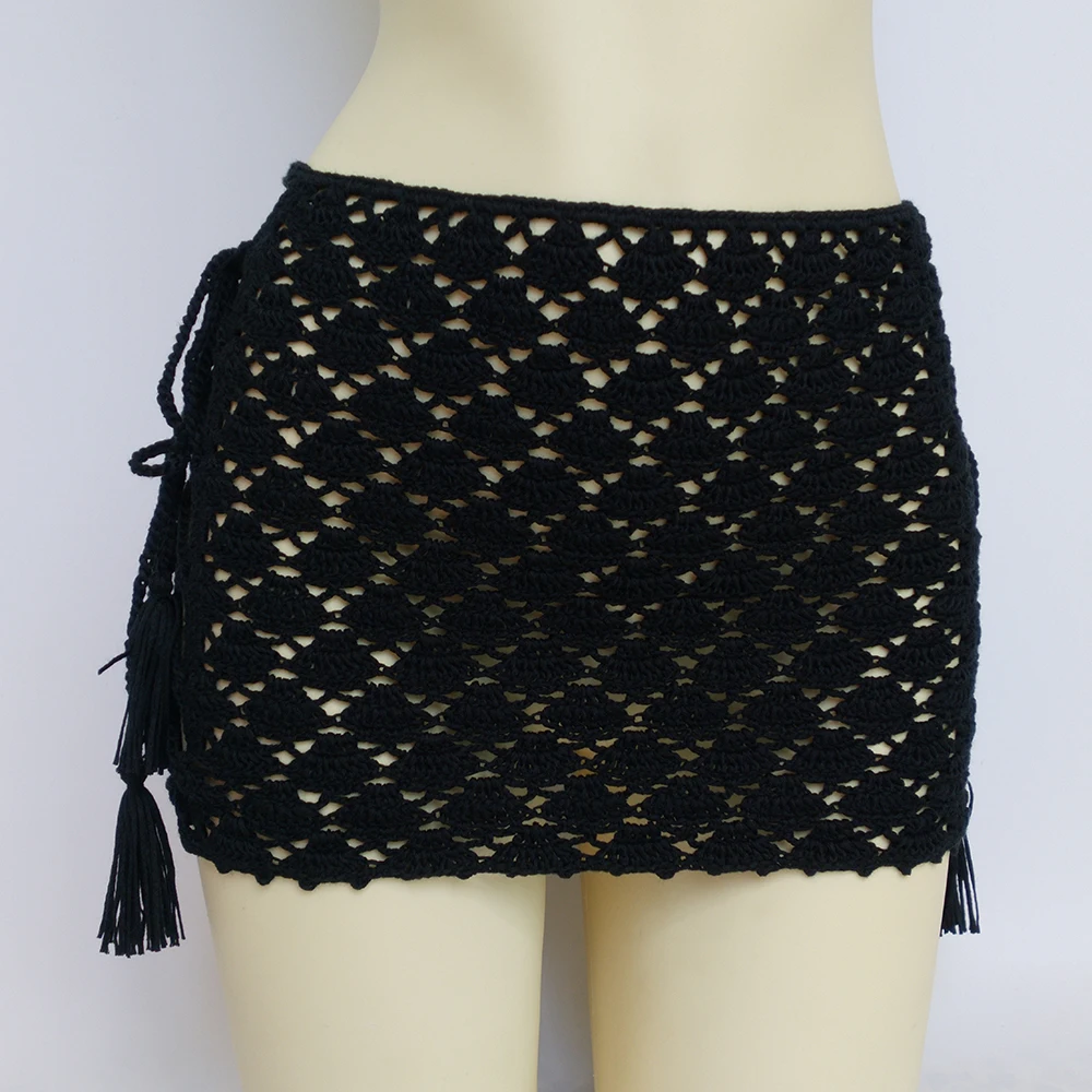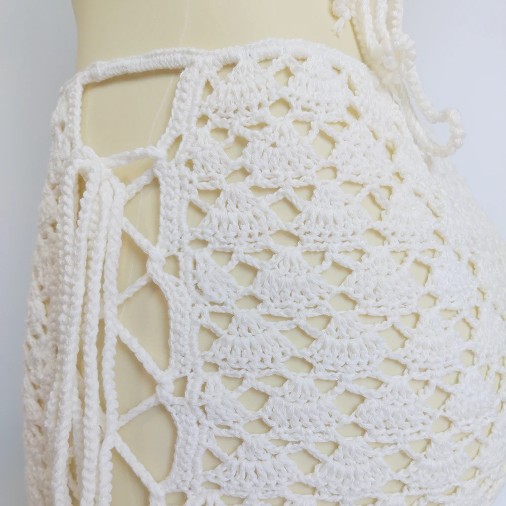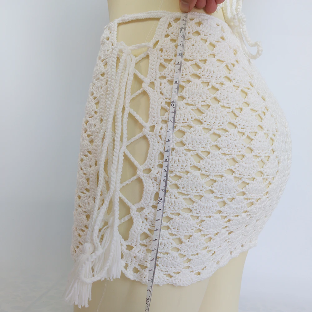 Сексуальное женское кружевное вязаное Бандажное бикини со средней талией, Пляжное платье, белое вязаное крючком короткое летнее мини-платье с юбкой
